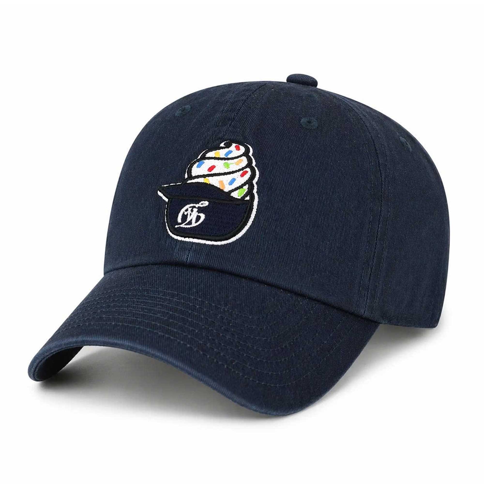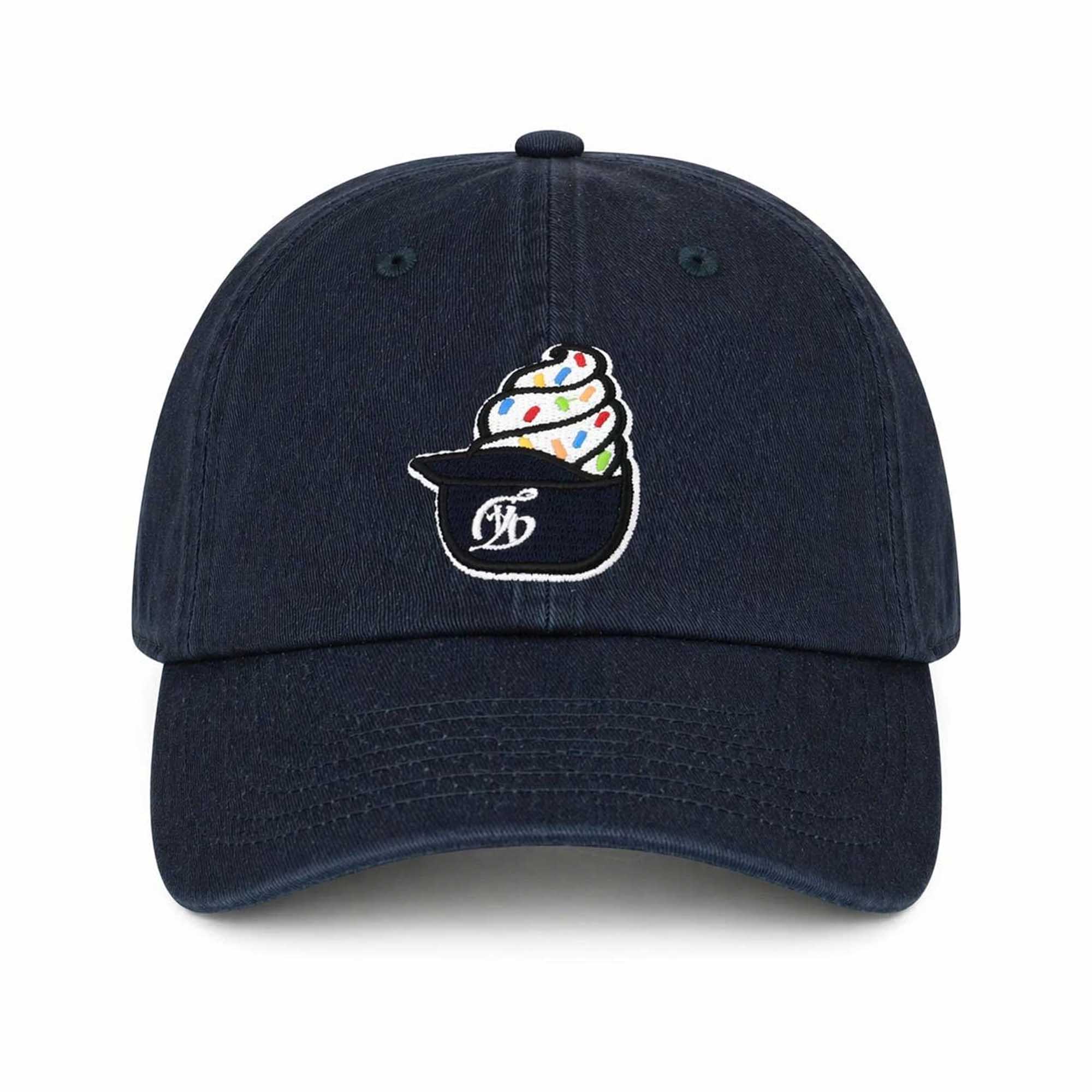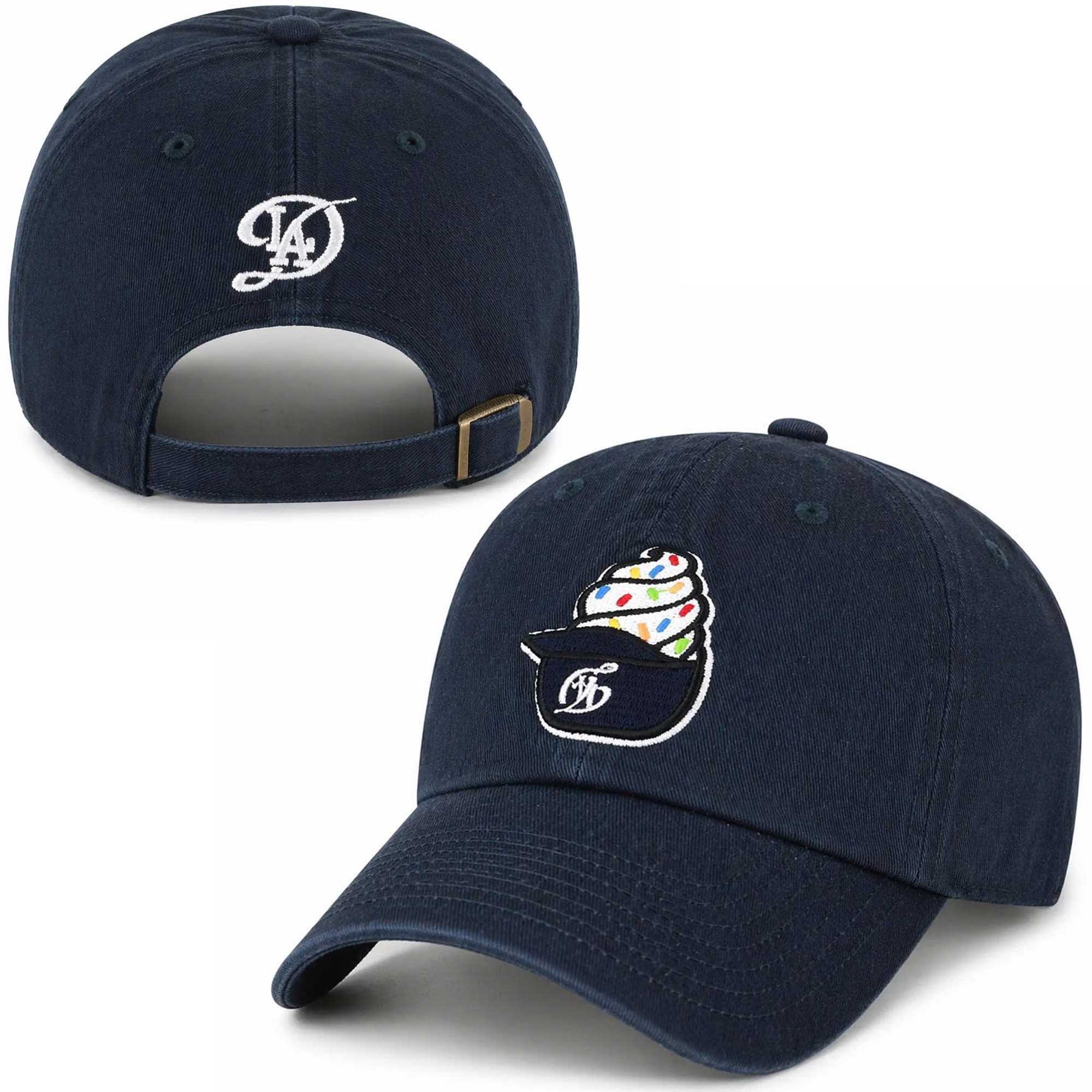 This cap features a deep navy blue color for a clean and timeless look. The front is embroidered with an ice cream cone motif and splashes of vibrant color, adding a playful touch, while the subtle Dodgers-inspired lettering showcases the team’s culture. An embroidered logo on the back adds a premium touch. The strong contrast between the dark fabric and bright embroidery makes the image stand out. The cap balances playful style with a sophisticated look for fans.