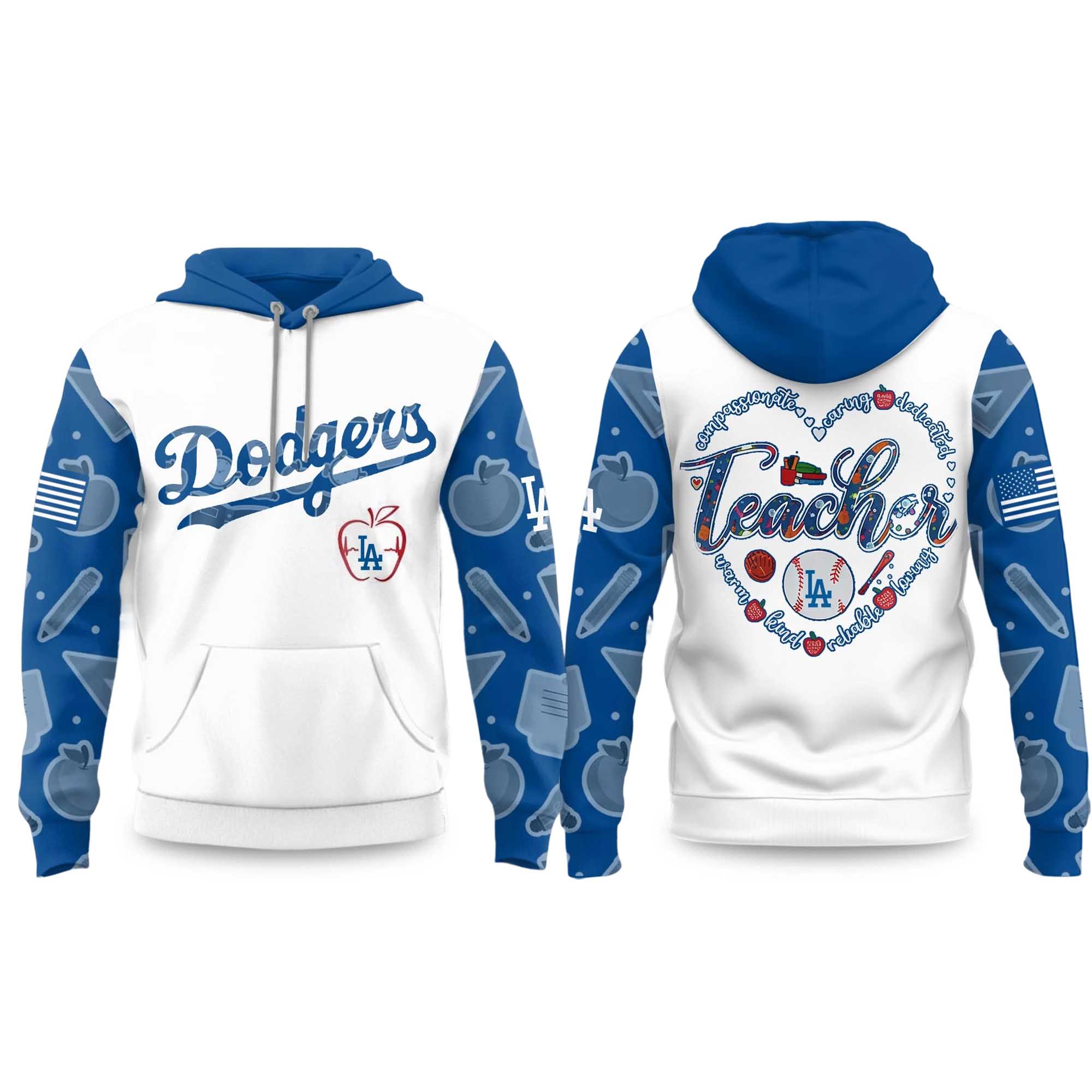 This hoodie combines a bright white background with eye-catching blue sleeves, adorned with classroom-inspired motifs. The front displays the iconic Dodgers logo, while the back features a vibrant image of the word Teacher surrounded by educational symbols arranged in a heart shape. The design feels lively and meaningful, expressing pride and appreciation for the team in a striking yet understated way.