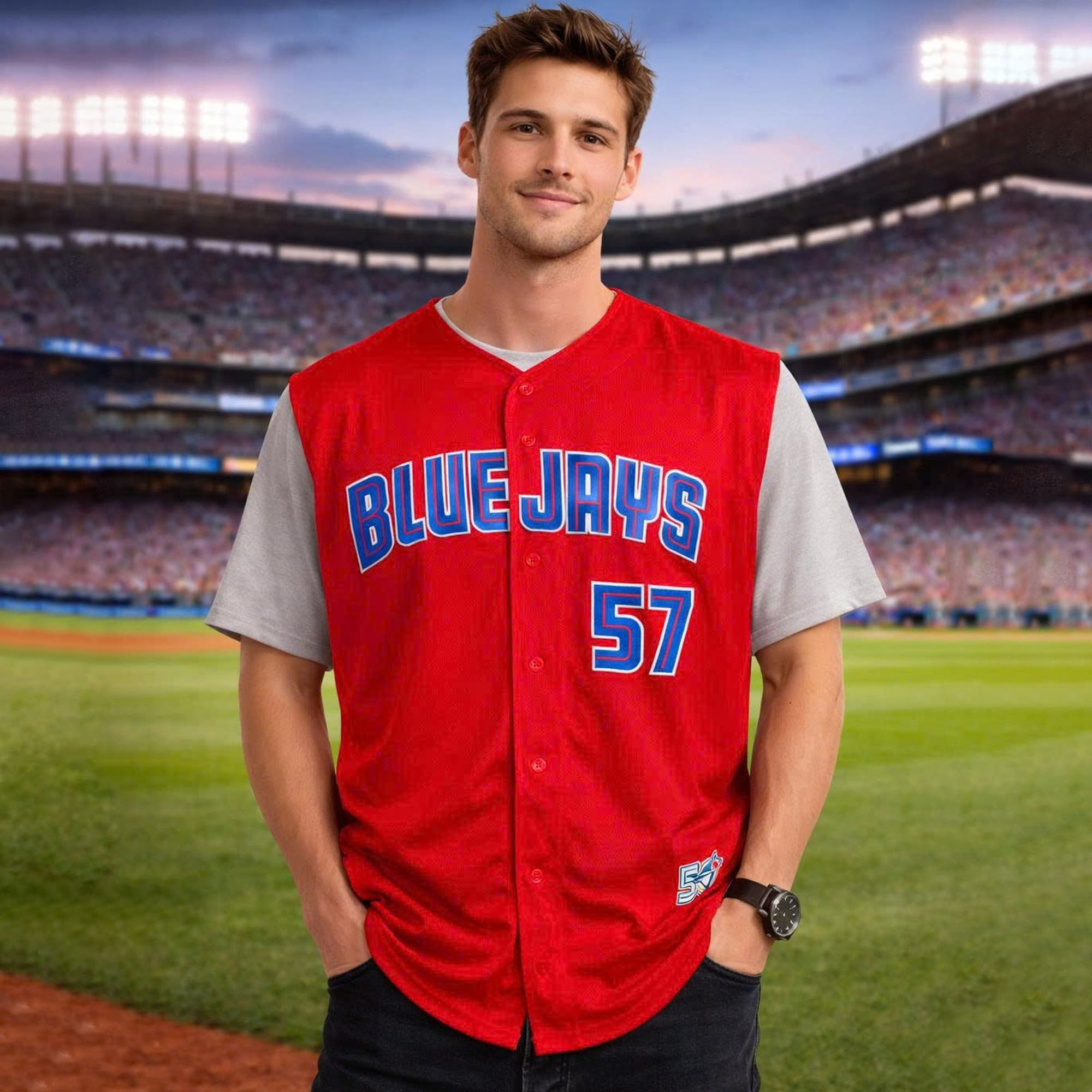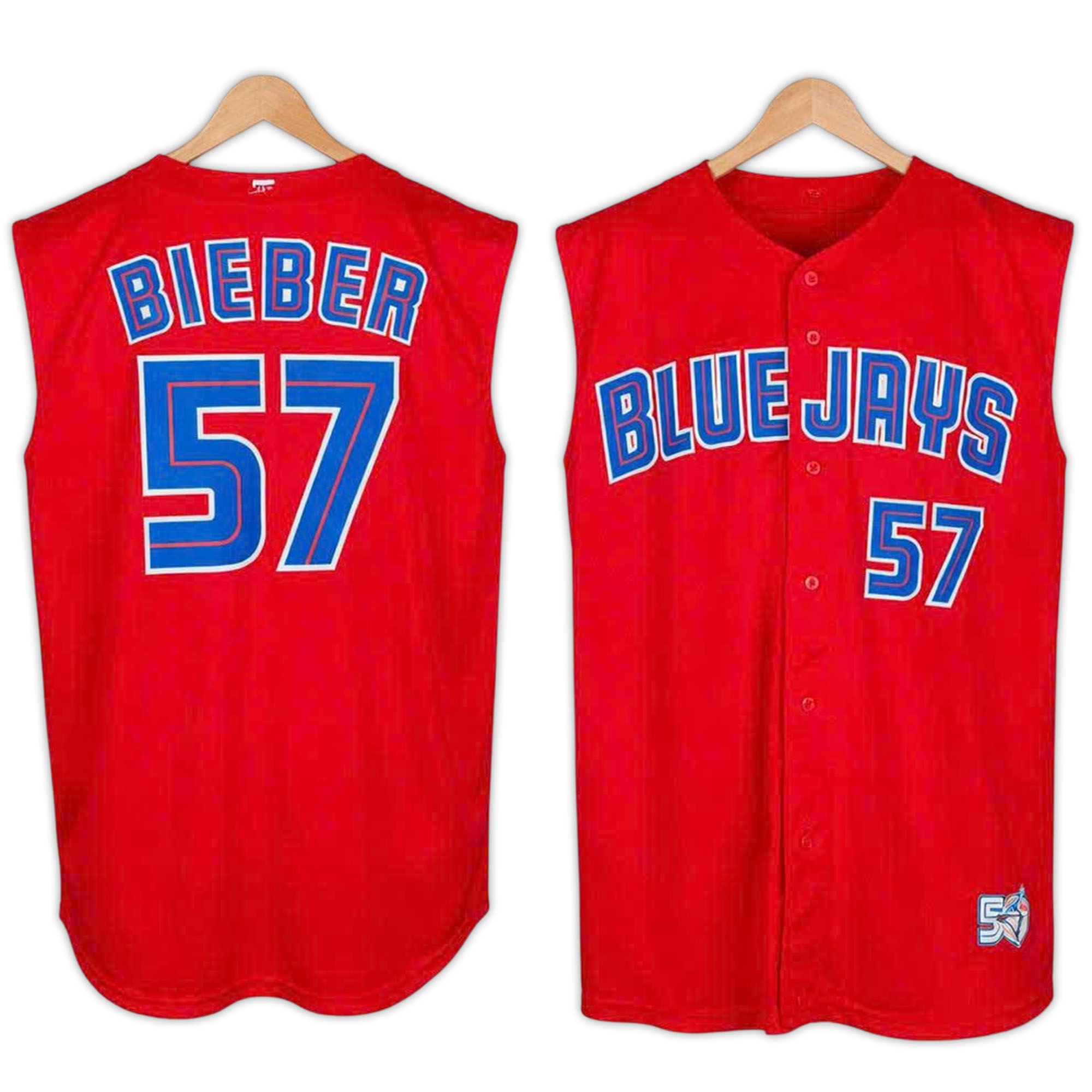 The 2026 Giveaway Blue Jays Shane Bieber Jersey exudes energy and confidence with its bright red background. The front features the words BLUE JAYS in dark blue, while the back highlights BIEBER’s name and the number 57 in sharp contrast. The sleeveless design offers a comfortable and sporty feel, ideal for warmer days or everyday wear. This is a great option for fans who want to stand out while still showing their support for the team.