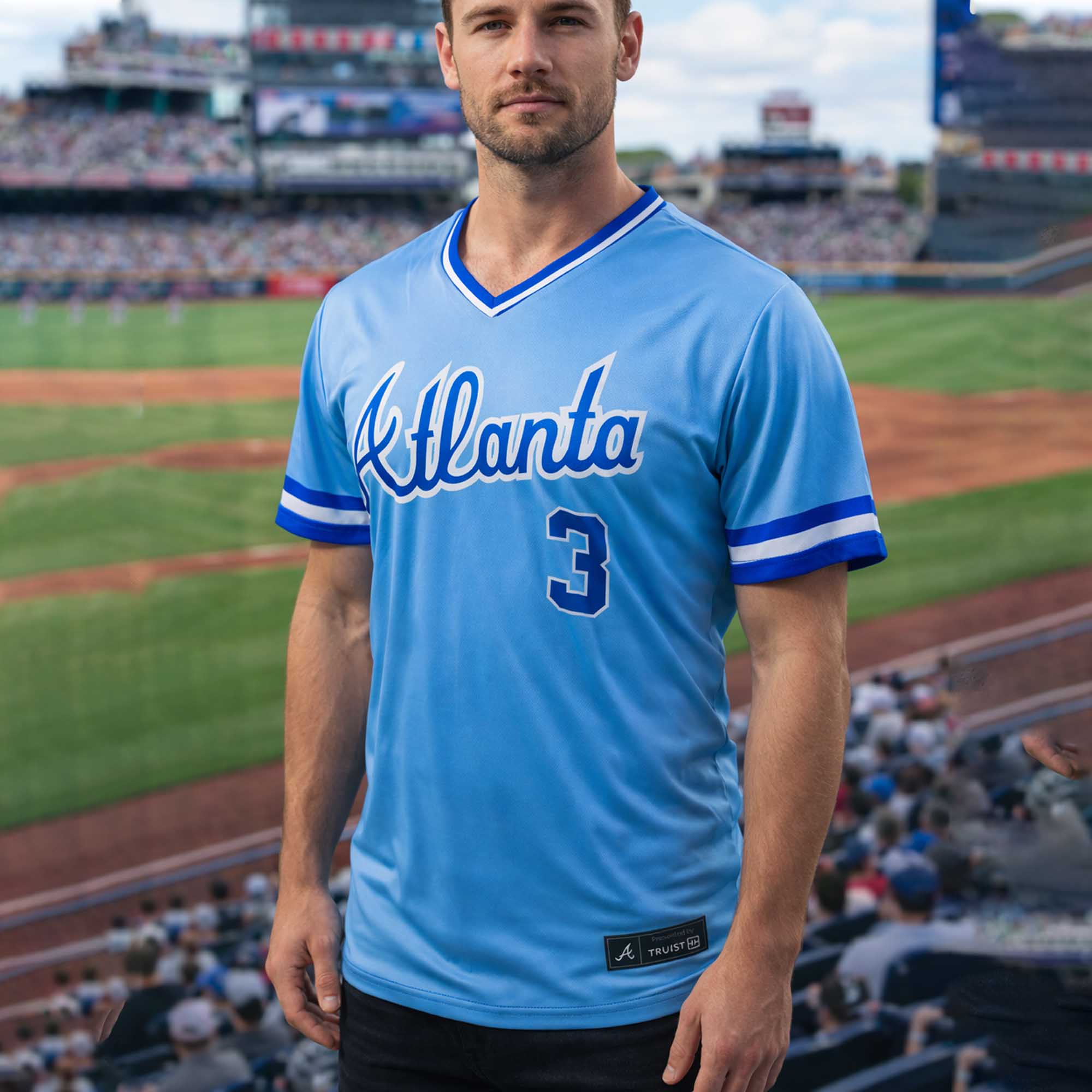 Crafted with attention to traditional details, this jersey reflects the classic Braves away look that shaped an era. The V-neck collar with contrasting trim creates a sharp look, while the lightweight mesh material improves airflow in hot stadium conditions. Durable embroidered motifs retain vibrant colors for a long time, ensuring the number 3 stands out season after season.