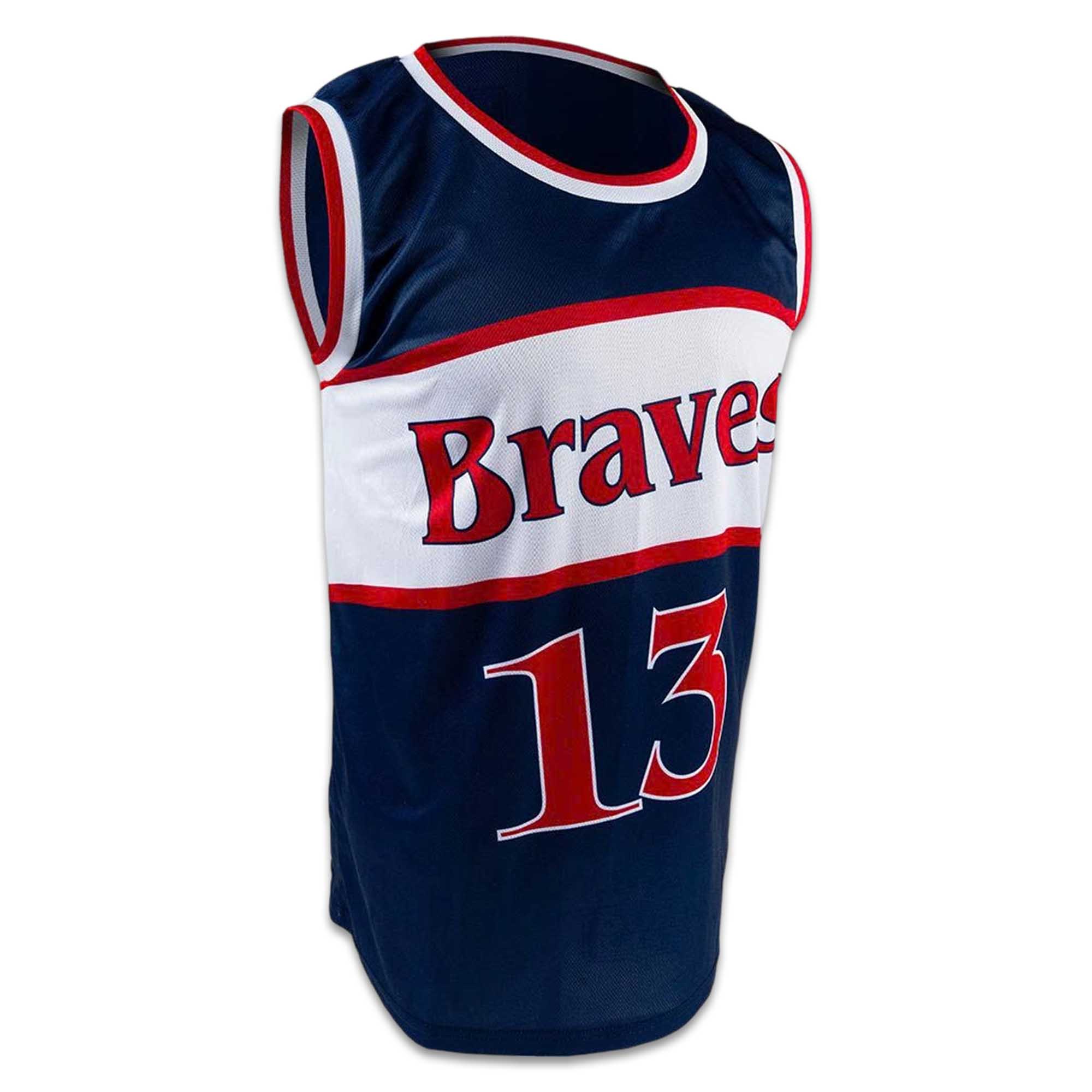This jersey combines the classic Braves identity with bold basketball style. The navy blue body of the jersey perfectly complements the red and white striped collar and sleeve trim, creating a strong visual contrast. The large “Braves” lettering on the chest conveys a sense of authenticity and energy, while the number 13 adds personality and prominence. Breathable material keeps you cool, and sturdy stitching ensures durability for many seasons.