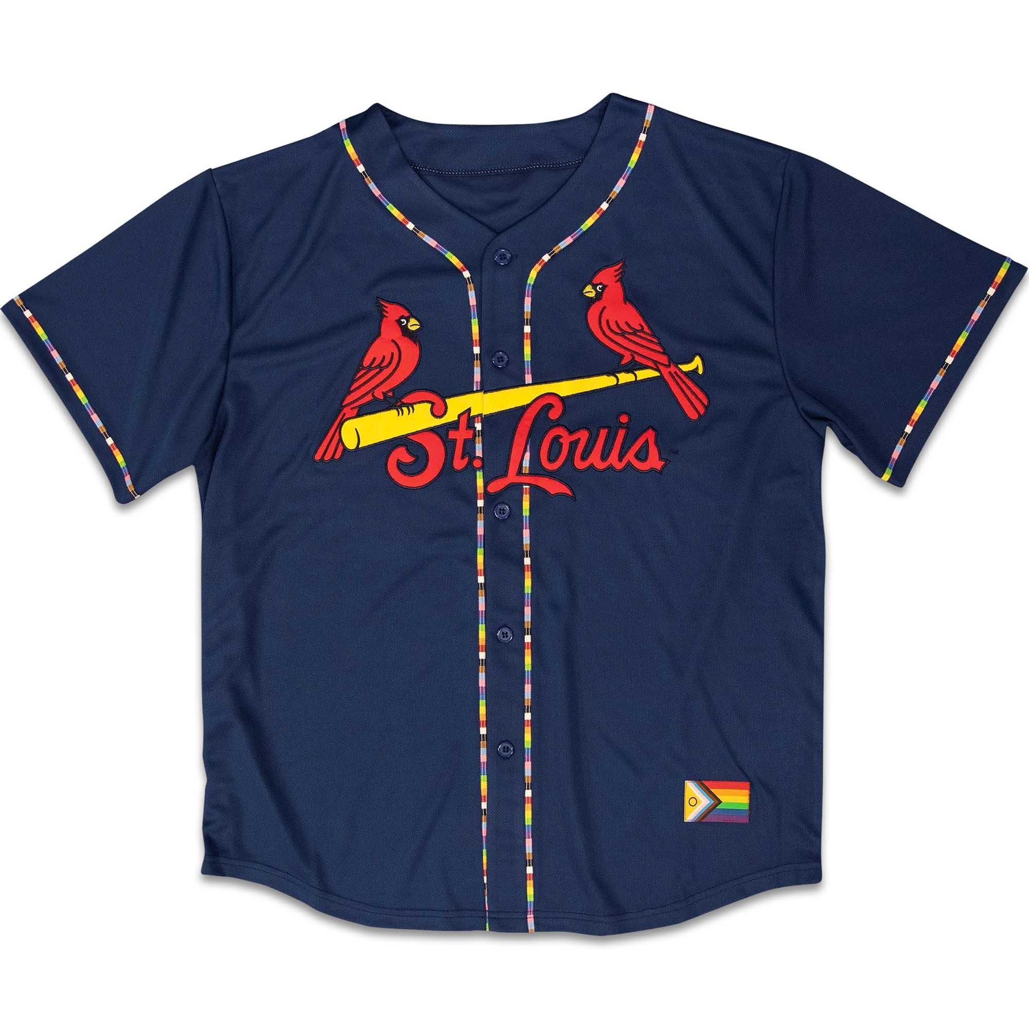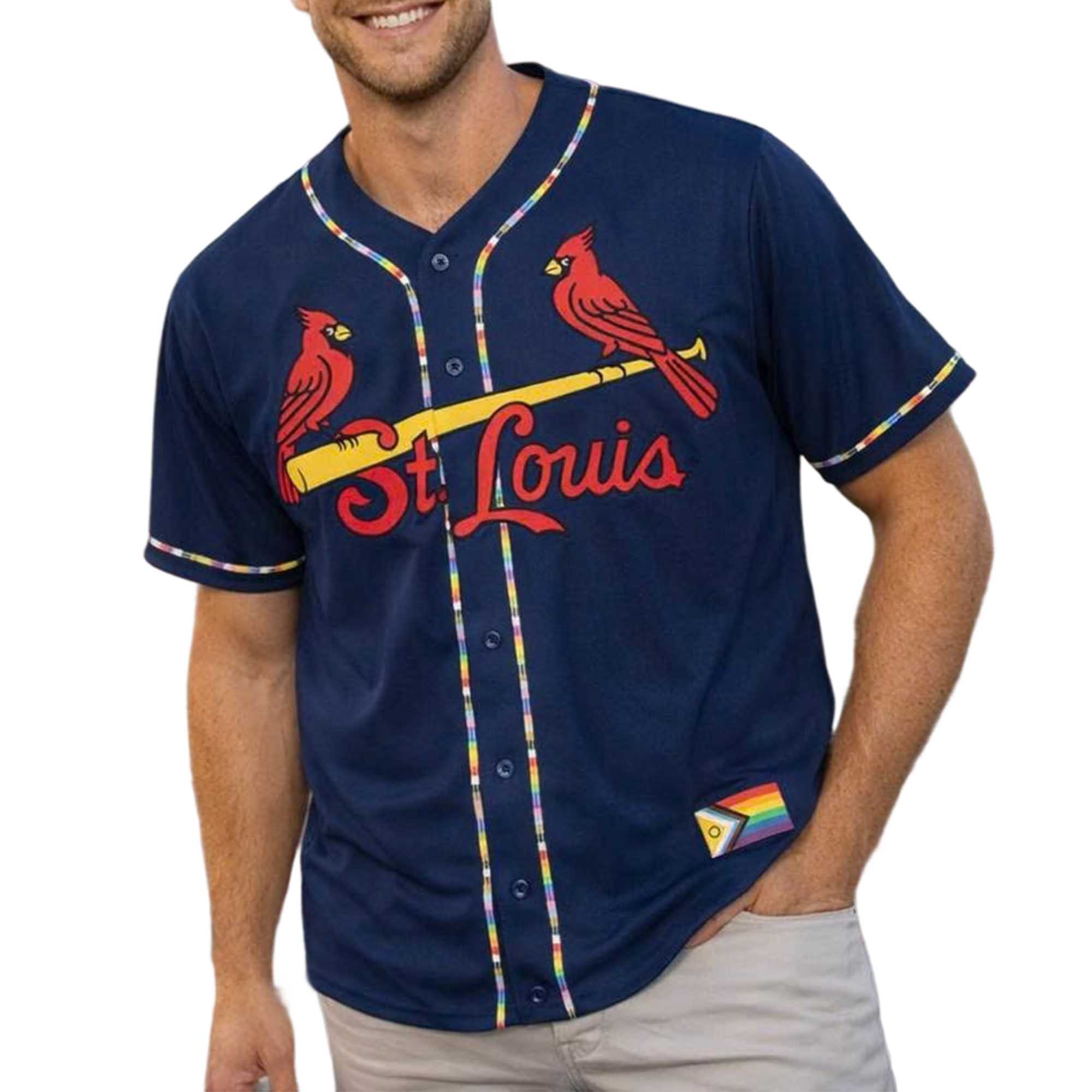This jersey retains the classic Cardinals identity while adding subtle Pride-inspired touches. The multicolored trim stands out against the navy blue background without overshadowing the design. The red birds remain prominent and eye-catching. Lightweight, breathable material keeps you comfortable during summer games, and the relaxed fit makes it easy to pair with jeans, shorts, or your game uniform.