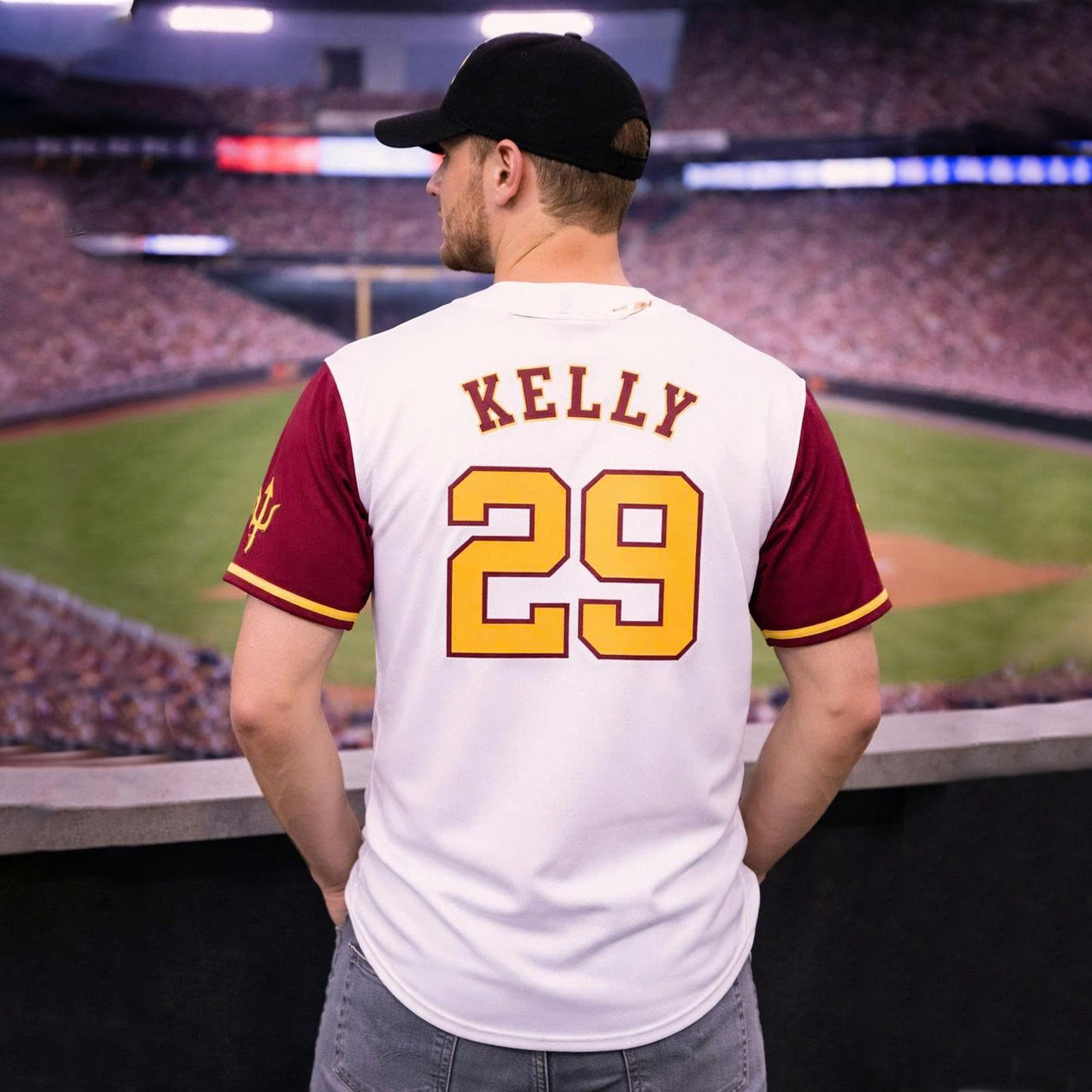 The 2026 Giveaway Dbacks ASU Night Jersey stands out with its pristine white background combined with deep burgundy sleeves inspired by ASU’s colors. The front features the familiar A logo, while the back is highlighted with yellow KELLY 29 lettering, creating a strong, sporty look. The button-down design maintains a classic baseball look, while the breathable material ensures comfort during long games or everyday wear.
