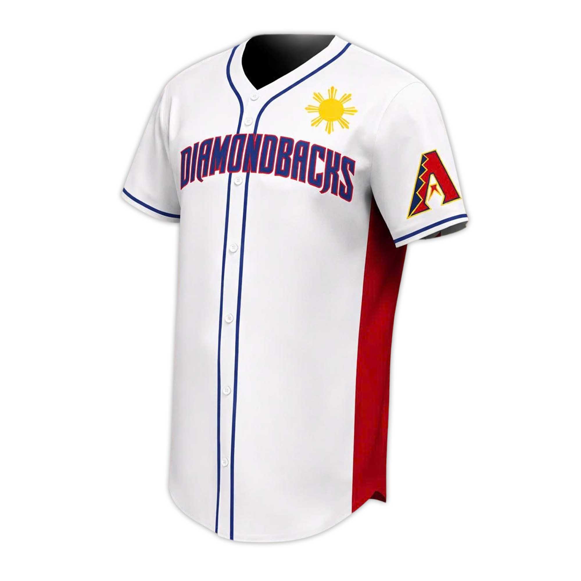 This jersey combines classic baseball style with cultural inspiration. The predominantly white color creates a clean look, while the blue trim adds accent and detail to the front. The sun emblem near the shoulder brings a recognizable Philippine cultural element, and the DIAMONDBACKS lettering expresses the team’s pride. The red accents on either side create contrast and give the shirt a dynamic look. The front button closure and breathable material keep fans comfortable during games or gatherings.