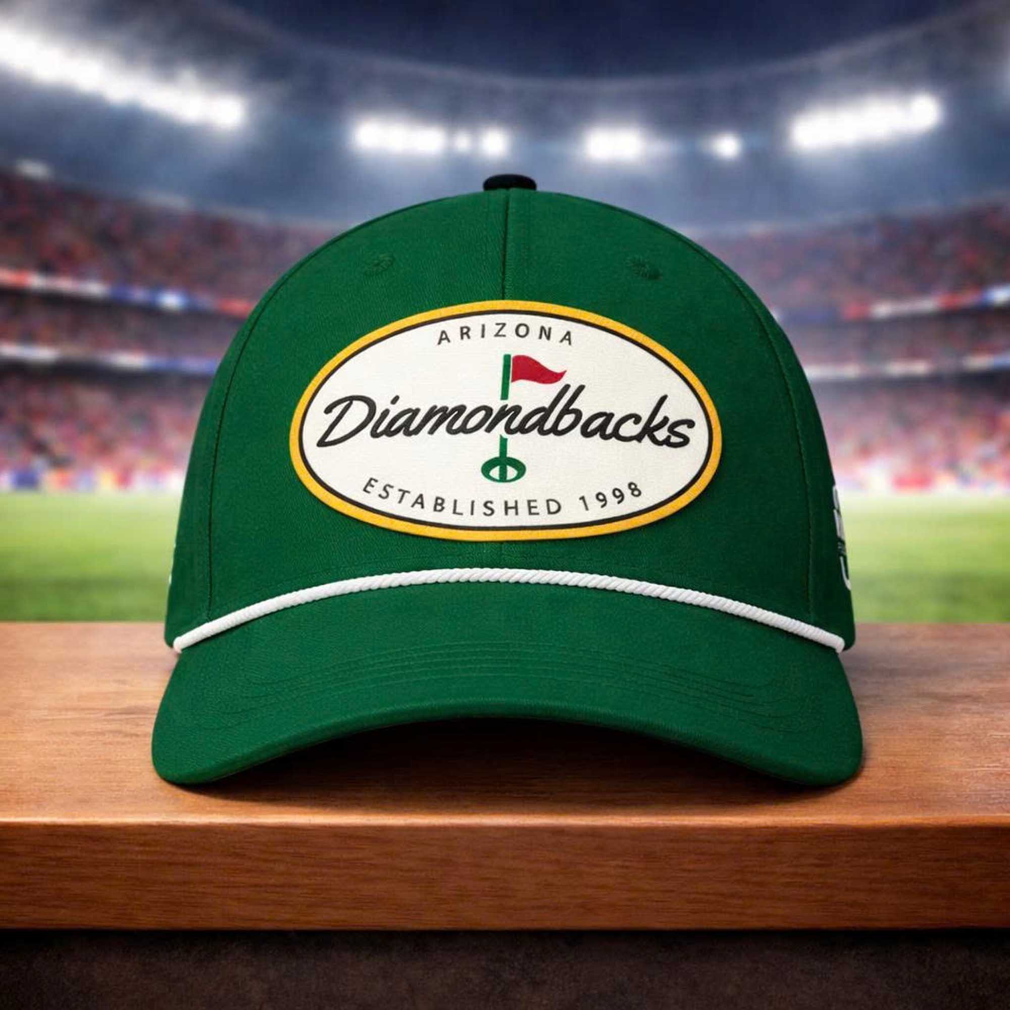 The cap features a golf-inspired green color, reflecting the color of the fairways on the golf course. A classic Diamondbacks logo patch on the front highlights the team’s identity, while the white rope detail across the brim creates a classic golf cap look. The curved brim provides sun protection for the eyes, and the sturdy crown ensures the cap looks neat and balanced when worn.