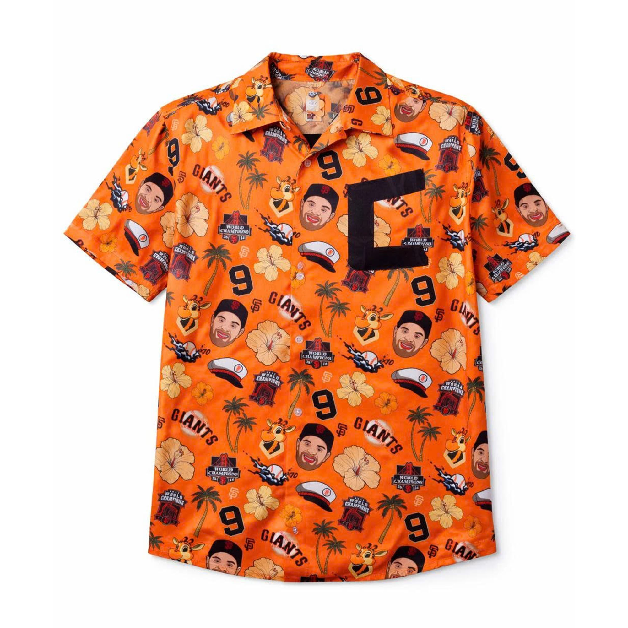 The striking design features a repeating illustration of Brandon Belt combined with tropical island-themed imagery. The bright orange background reflects the Giants’ signature colors, making it instantly recognizable. Short sleeves and a loose fit allow for easy movement, while the soft material provides all-day comfort.