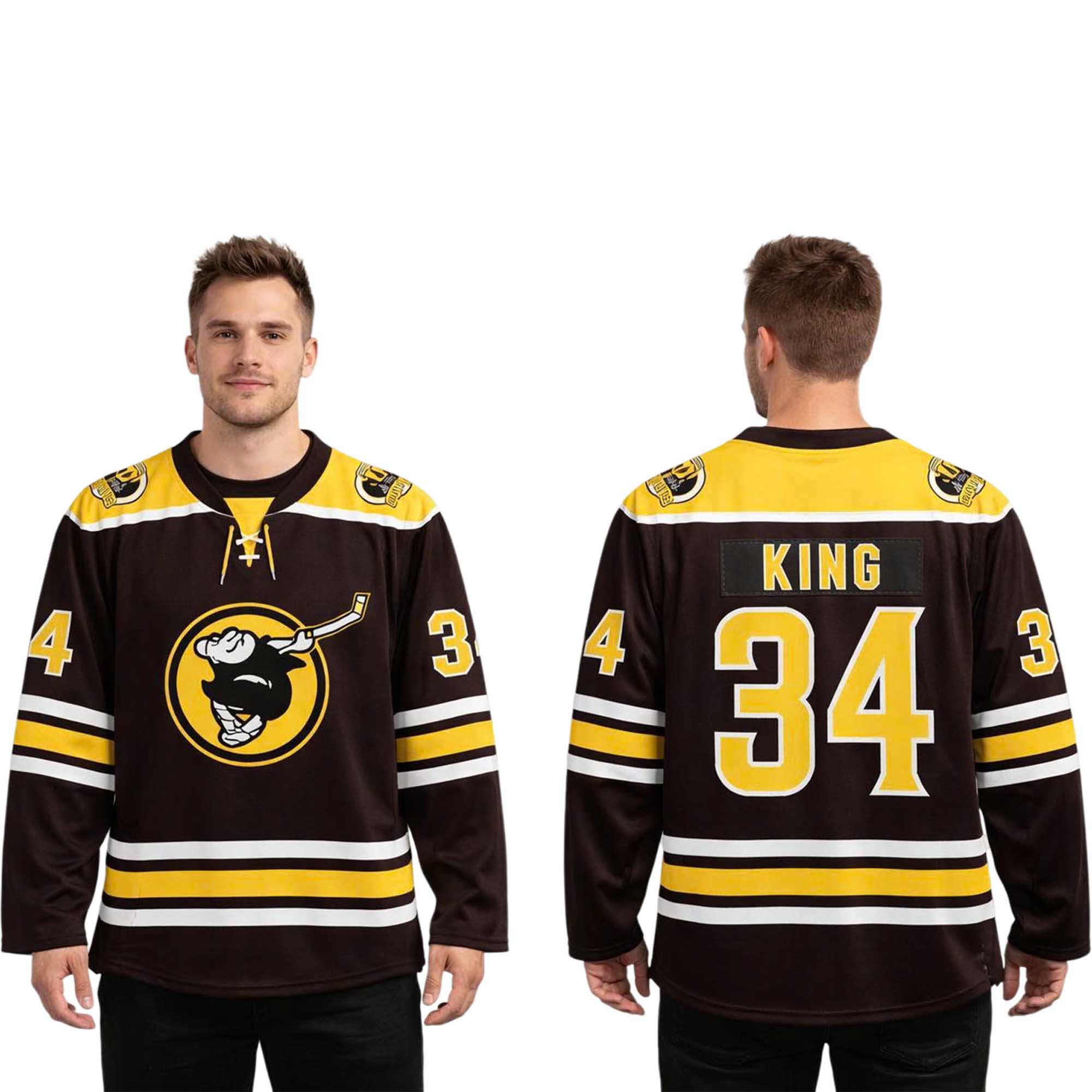 This jersey stands out with its classic hockey-inspired design, featuring layered stripes on the sleeves and waist. The front logo depicts a unique character holding a hockey stick, adding personality to the design. The large, clear 34 on the back gives it a strong, sporty look. The lace-up collar detail adds a touch of authenticity, while the color contrast balances and creates an eye-catching overall design.