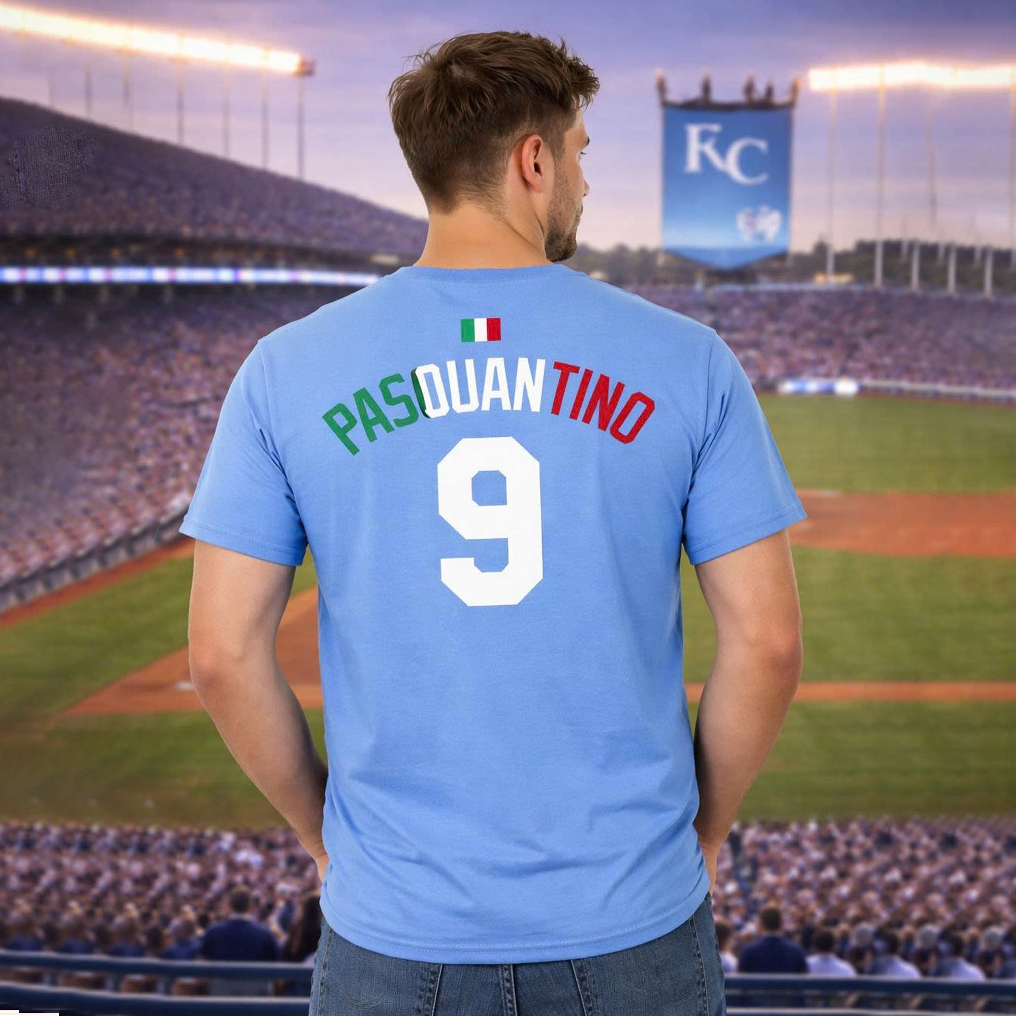 The 2026 Giveaway Royals Italian Heritage Shirt features a light blue background that highlights eye catching, prominent graphics. The front of the shirt features the word Royals printed in three colors green, white, and red, representing the Italian flag along with the number 9. The back displays the word PASQUANTINO above the number 9, accented with a small Italian flag detail near the collar, creating a strong cultural connection.