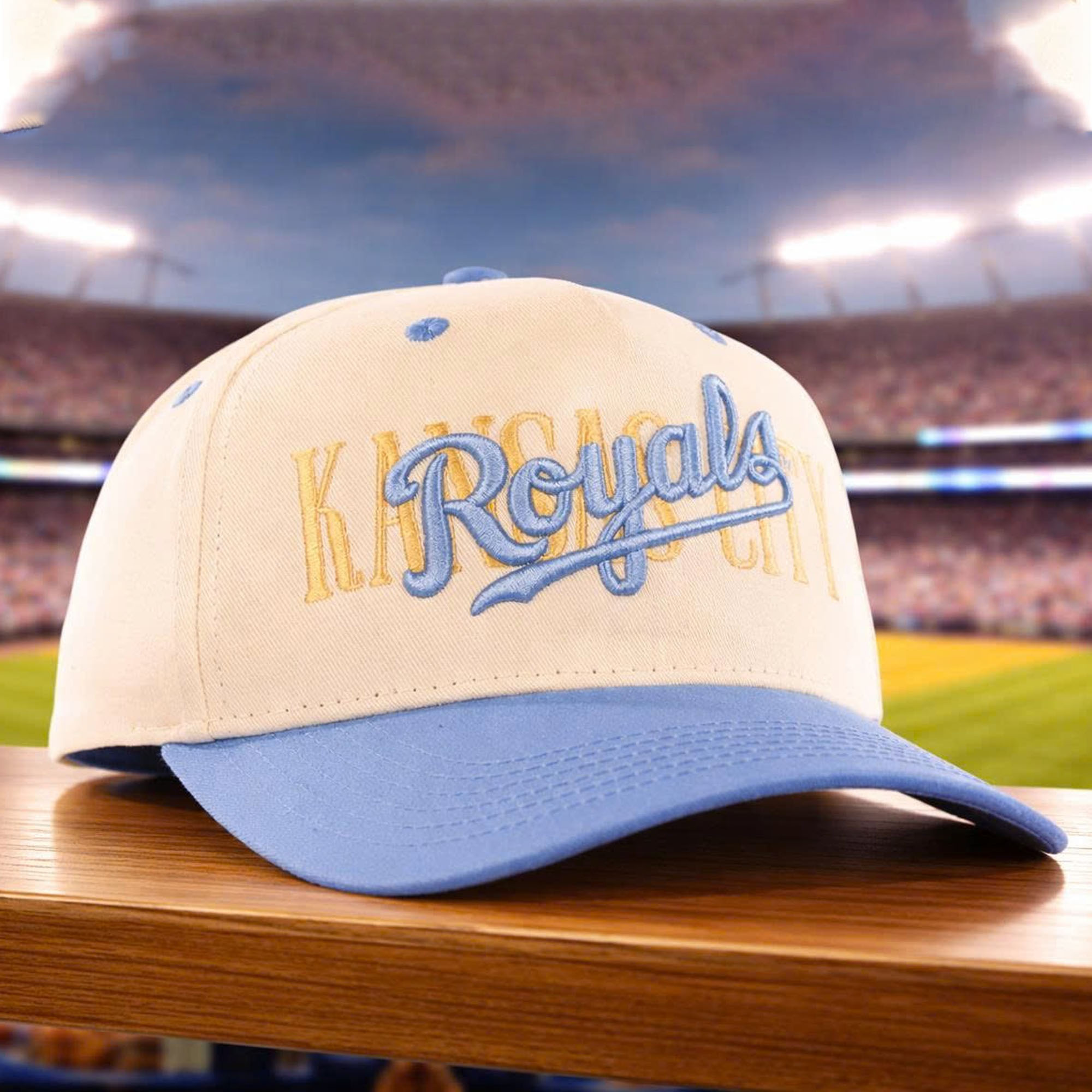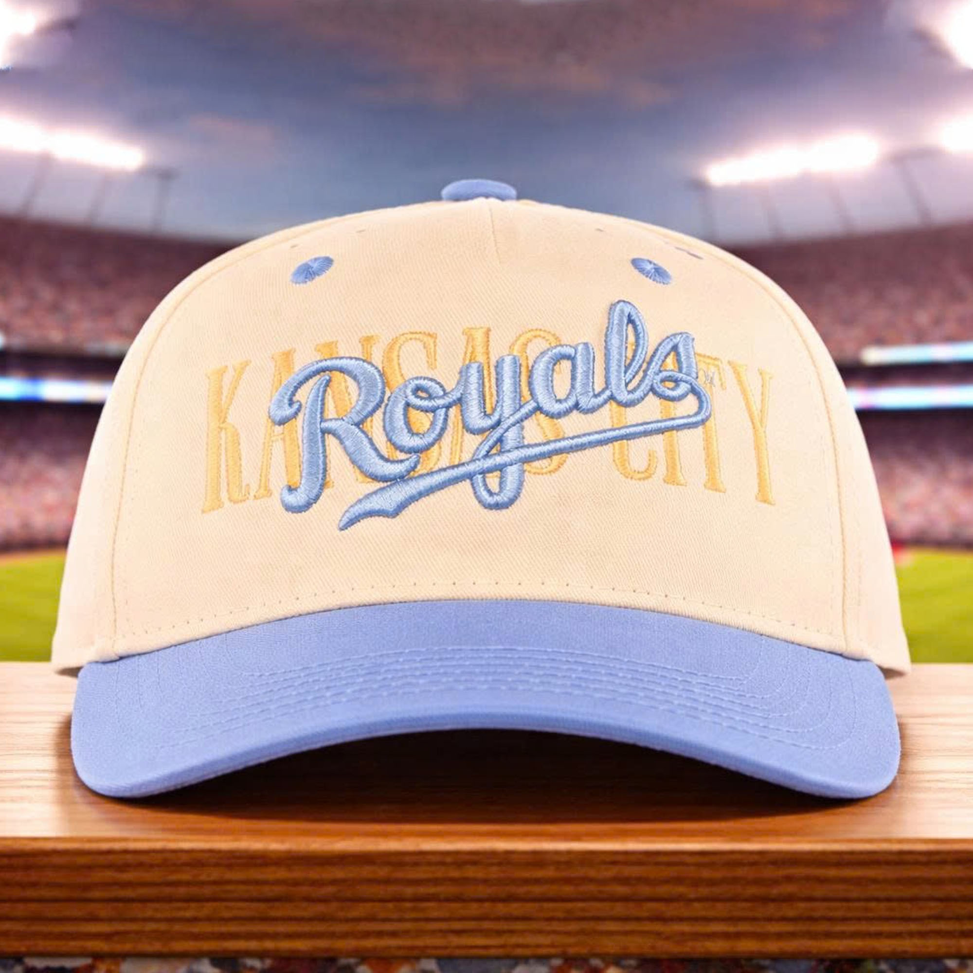 The hat features a light cream crown combined with a light blue brim, creating an elegant and balanced look. The front features a striking Royals lettering superimposed on the subtle Kansas City text, adding depth and personality. The color choice evokes a sense of calm and friendliness, reflecting the caring and dedicated spirit associated with nurses. This is an easy-to-wear hat, suitable for both competition days and everyday wear.