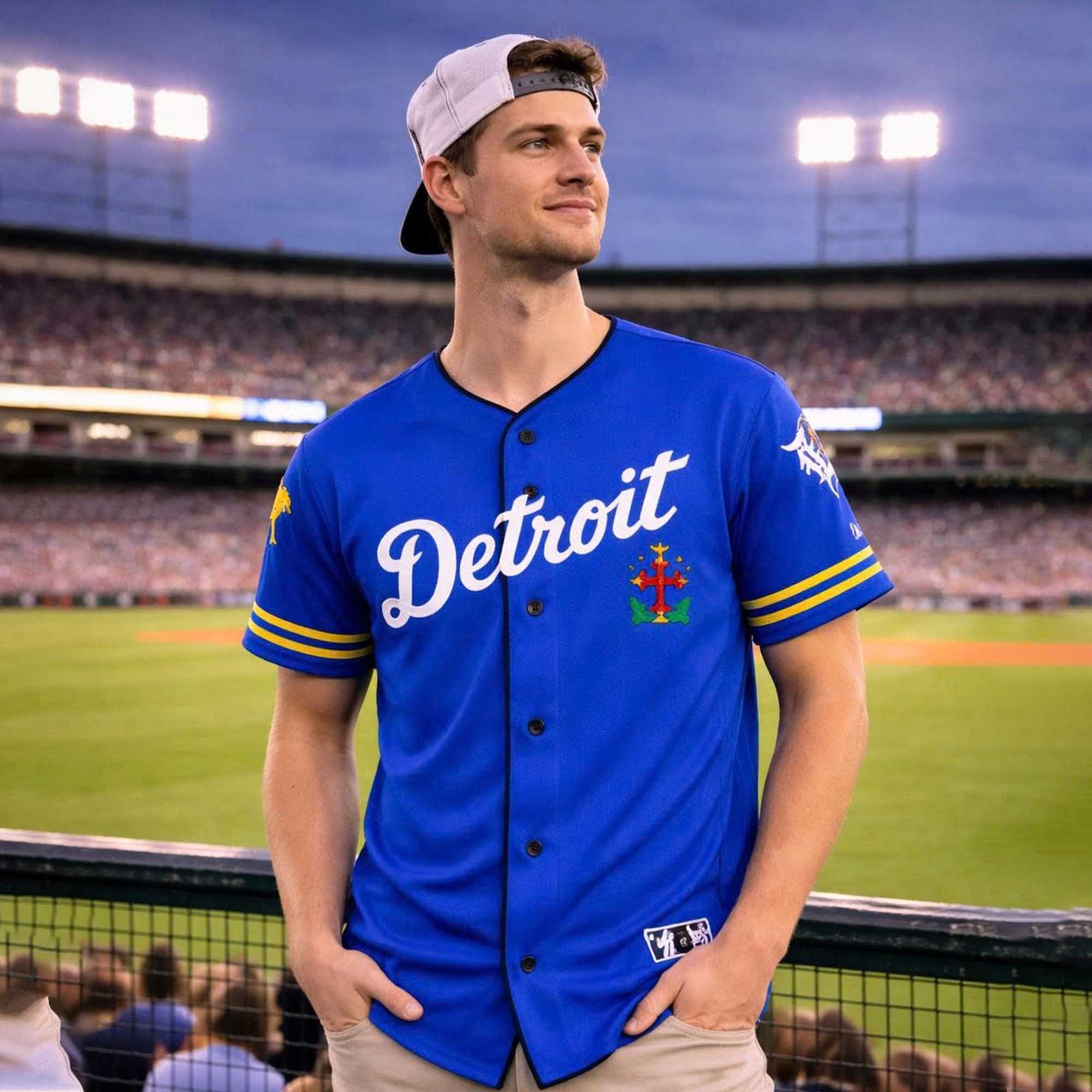 The jersey features a deep blue background with classic Detroit and Tigers lettering, making the team’s image easily recognizable. Cultural details are subtly integrated, adding depth without overshadowing the design. The yellow stripes on the sleeves create contrast and energy, while delicate embroidery adds texture and emphasis. The overall design balances tradition and cultural expression, making the jersey both meaningful and easy to wear.