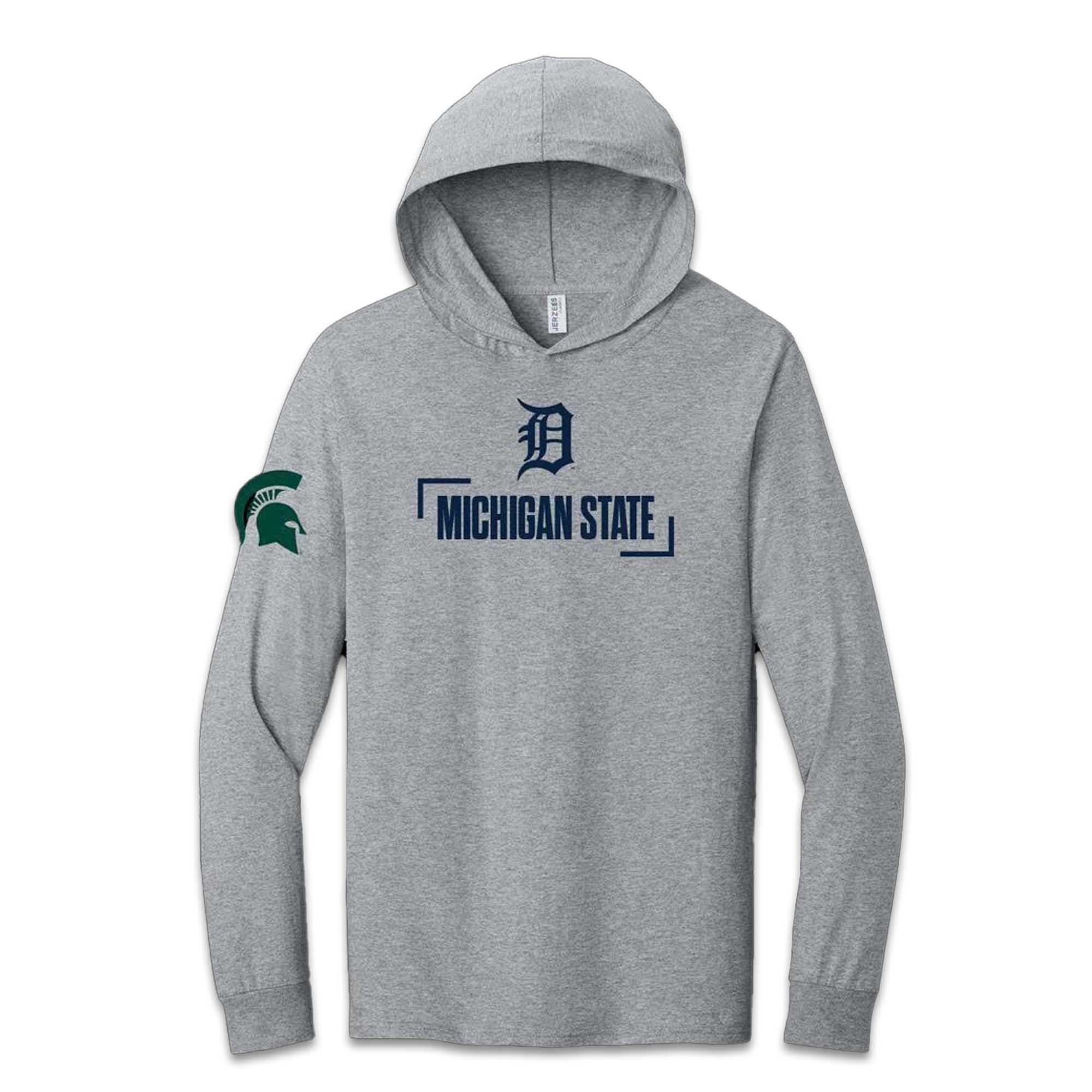 This hoodie features an ash grey base, making it easy to coordinate with everyday outfits. On the chest, the prominent “Michigan State” lettering sits confidently beneath a classic “D” detail inspired by Detroit baseball heritage. The sleeves feature Spartan green accents, completing the look. The soft inner lining keeps you comfortable during chilly night games or early mornings at school. The adjustable hood and ribbed cuffs provide a snug and warm fit.