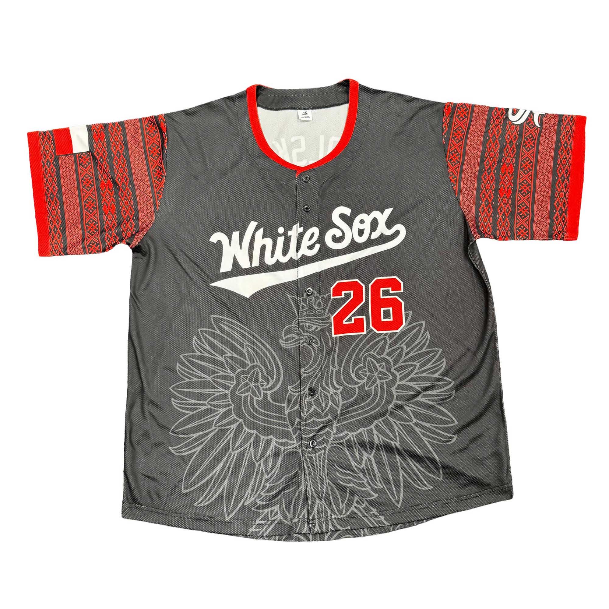 This jersey combines classic baseball style with cultural iconography. The grey body highlights the traditional White Sox lettering on the chest, while the red number adds a strong athletic accent. The detailed eagle imagery across the lower front represents Polish identity and pride. The sleeves feature intricate red folk art motifs inspired by traditional Polish designs, creating a vibrant contrast against the grey background. The breathable athletic fabric ensures comfort during games, events, or everyday wear.