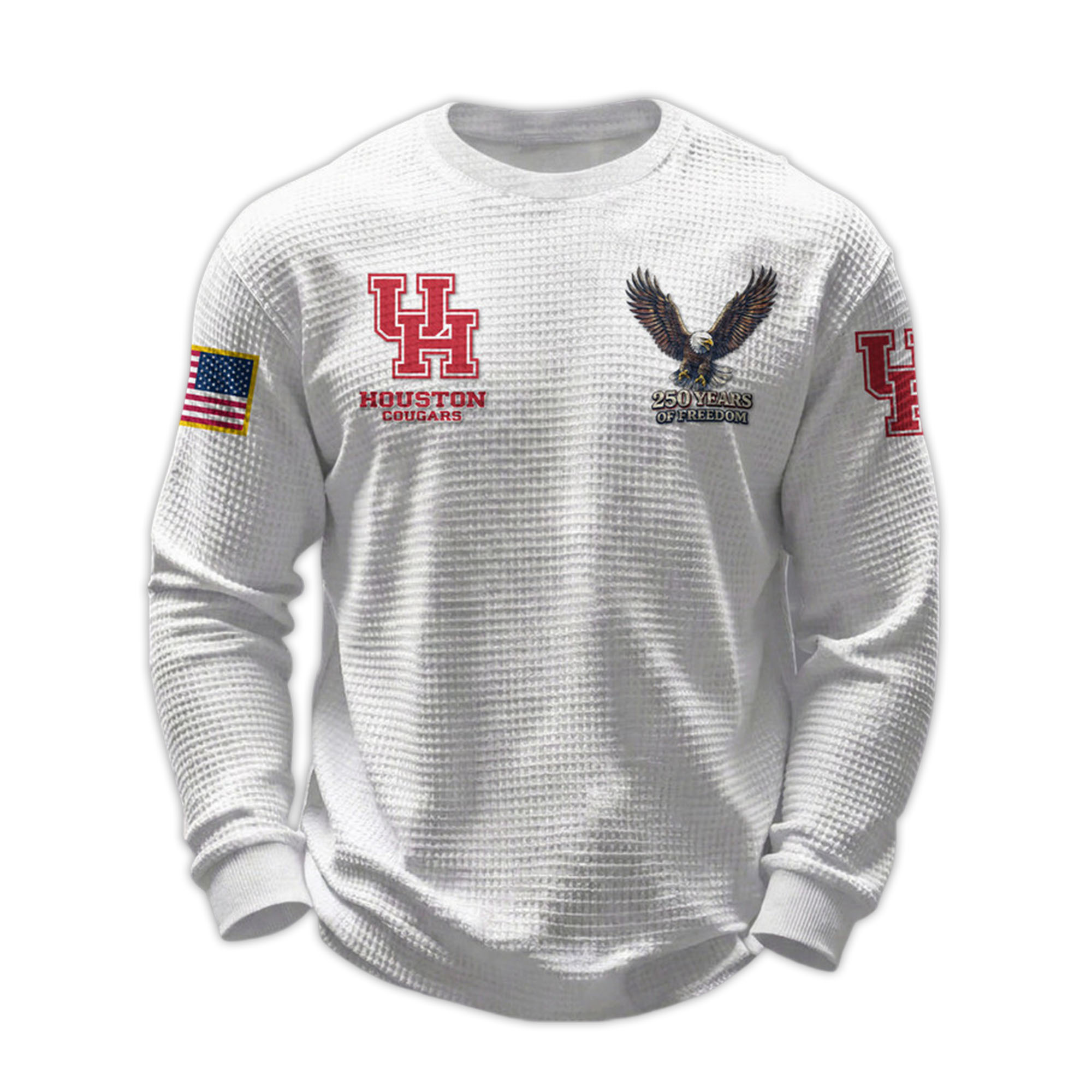 The 2026 Houston Cougars 250 Years Of Freedom Waffle Sweatshirt combines modern comfort with a meaningful celebratory theme. Designed to commemorate a historic milestone, it highlights Houston pride while reflecting a broader story of unity and freedom. With its pristine white exterior and striking details, this sweatshirt is a stylish and meaningful addition to any fan’s wardrobe.