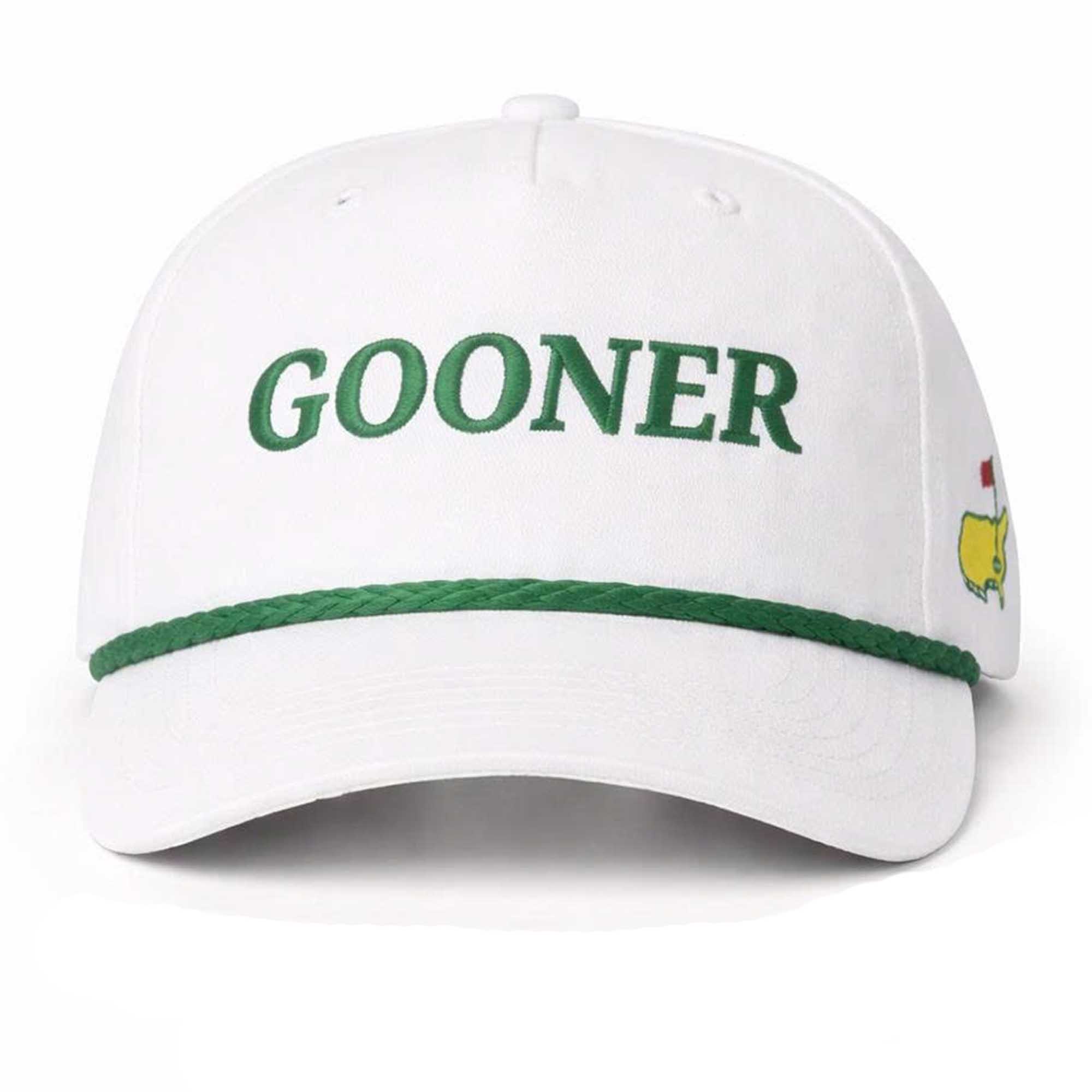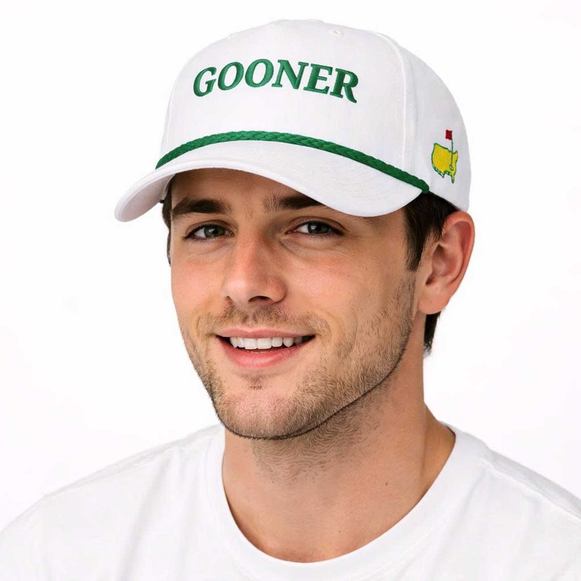 The front features the word GOONER embroidered in bold green, creating a strong yet simple visual accent. The white background keeps the overall look fresh and easy to match with various outfits. The green rope detail across the brim adds a subtle classic golf touch, while the small patch on the side, inspired by Masters elements, highlights the hat’s personality. The curved brim completes the classic hat shape, suitable for both sporty and casual styles.