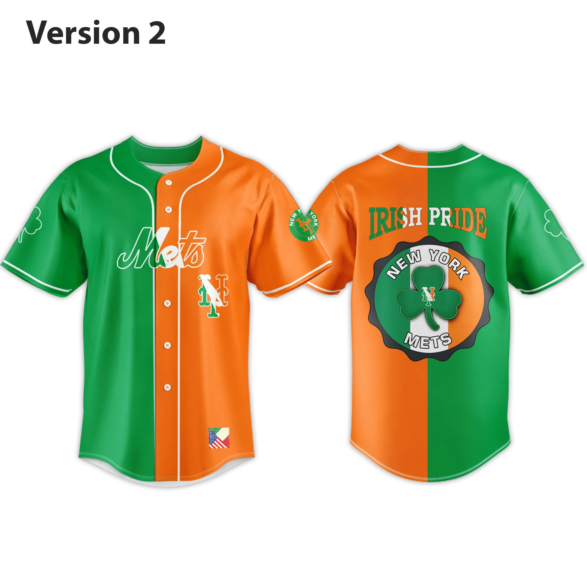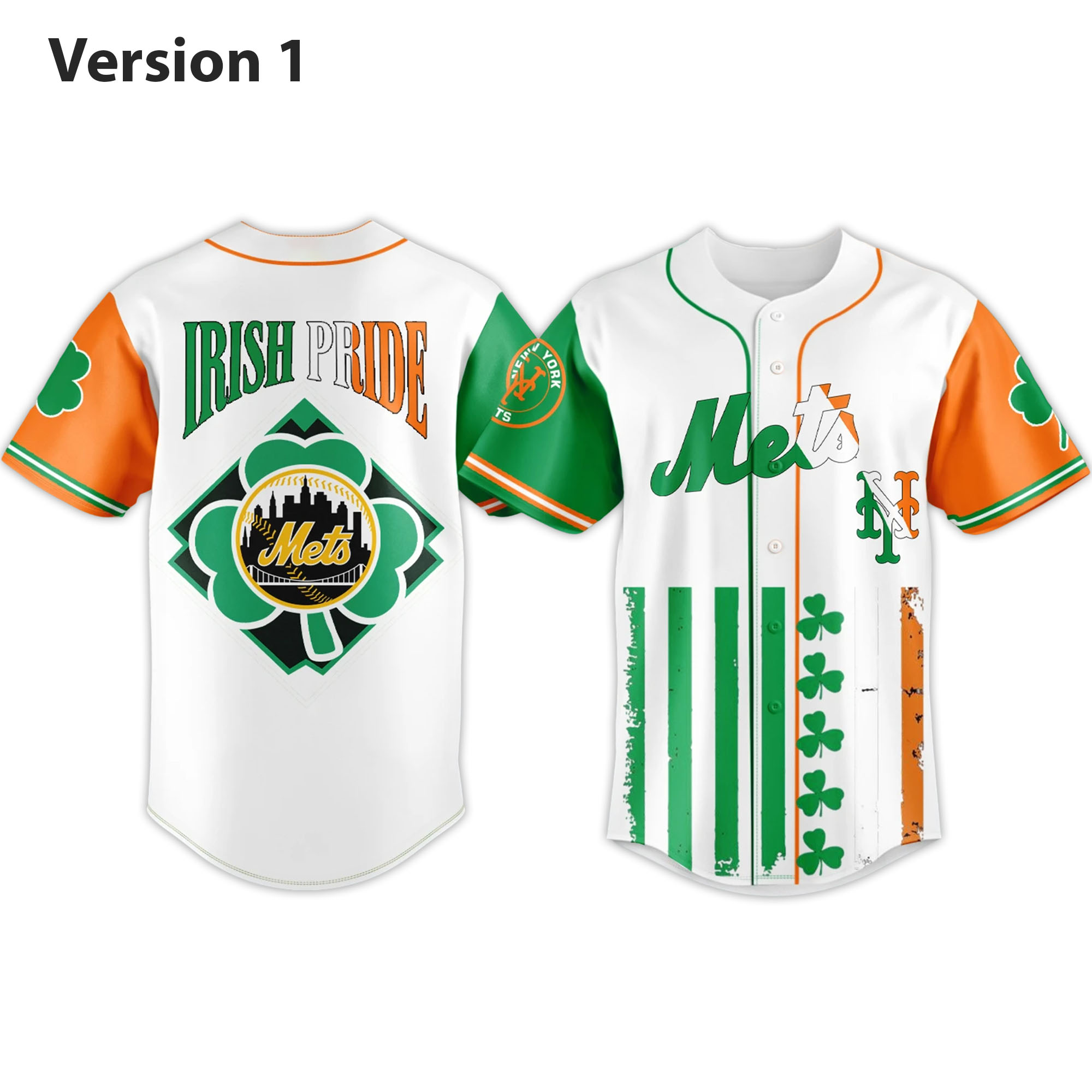 The 2026 Mets Irish Heritage Baseball Jersey offers a vibrant blend of tradition and team identity. With a pristine white background, the striking green and orange accents immediately stand out, symbolizing Irish heritage. The front features the Mets lettering with vertical shamrock details, while the back highlights the Ireland Pride slogan along with a shamrock-inspired logo, creating a jersey full of energy and meaning.