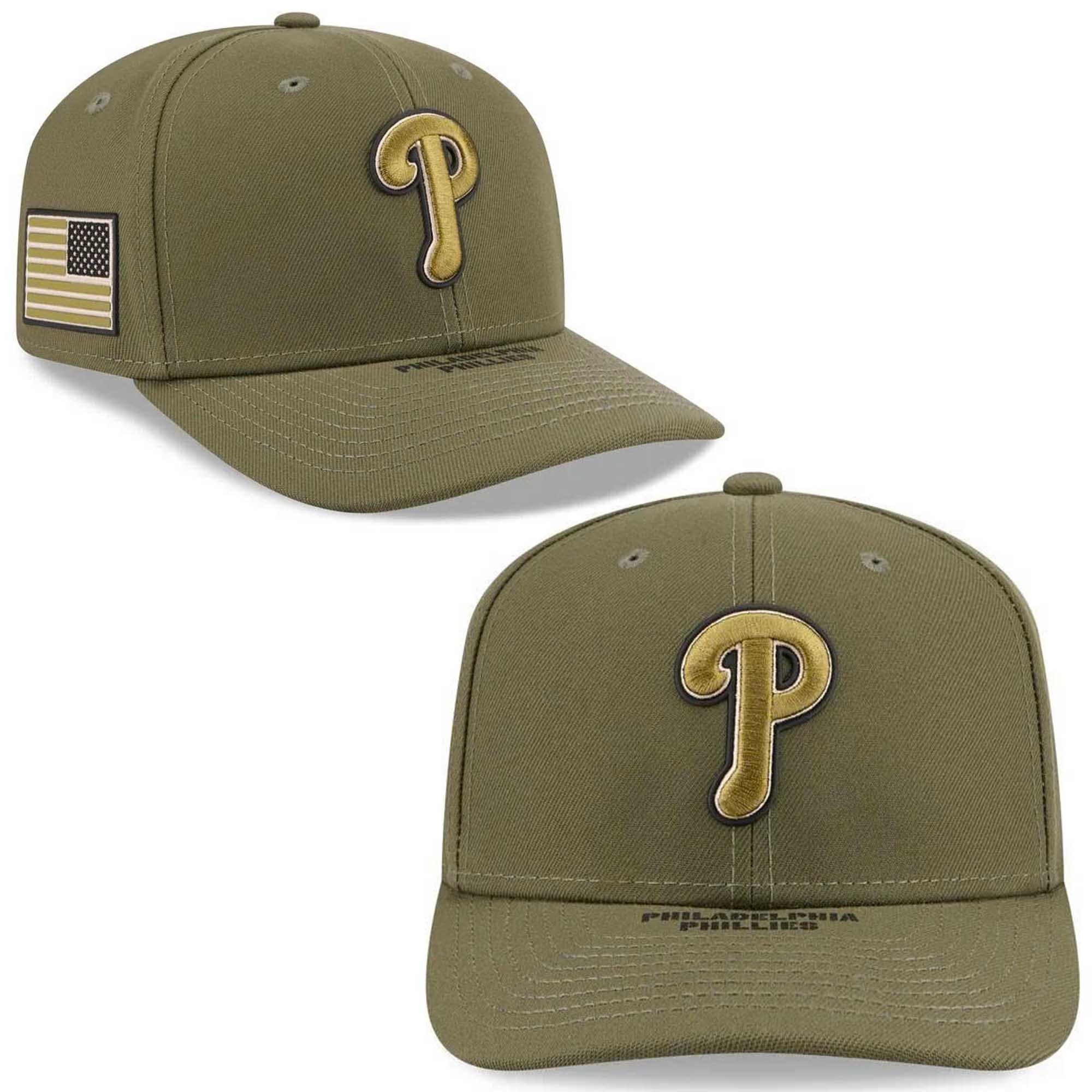This cap features an olive green crown and brim inspired by military tones, giving it a strong yet versatile look. The front displays the classic Phillies P logo, embroidered in gold with a dark border for added depth. A matching American flag patch on the side adds a respectful patriotic touch. The team lettering is subtly embroidered on the brim for added character without overwhelming the design. The balanced six-panel construction and curved brim create a timeless baseball silhouette, easily paired with modern streetwear or classic fan attire.