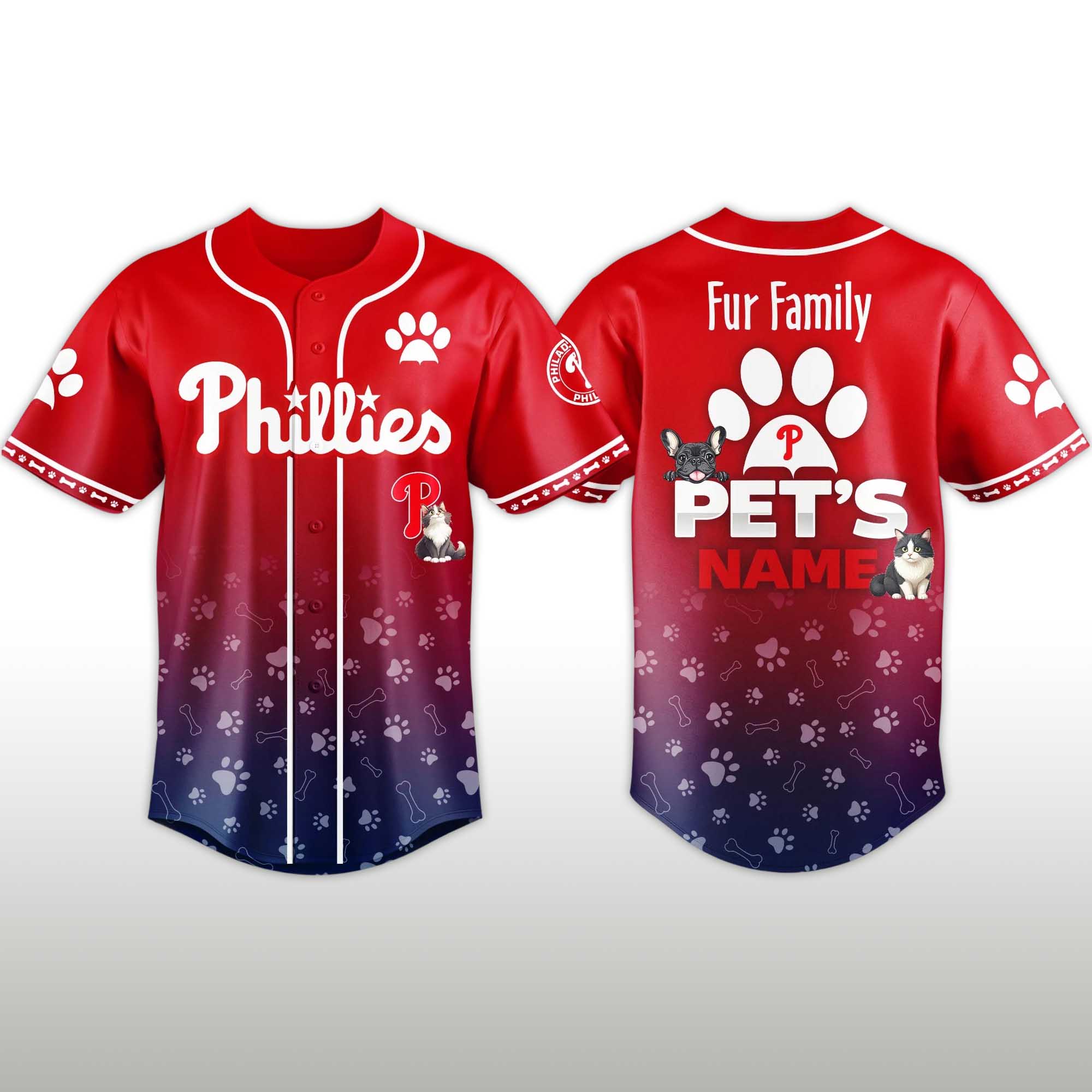 The jersey stands out because it celebrates both team pride and the friendship with pets. Fans appreciate the bright colors of the Phillies, the fun paw print imagery, and the option to personalize the shirt with their pet’s name. It represents memorable experiences at the field and the joy of sharing baseball moments with a loyal furry friend.