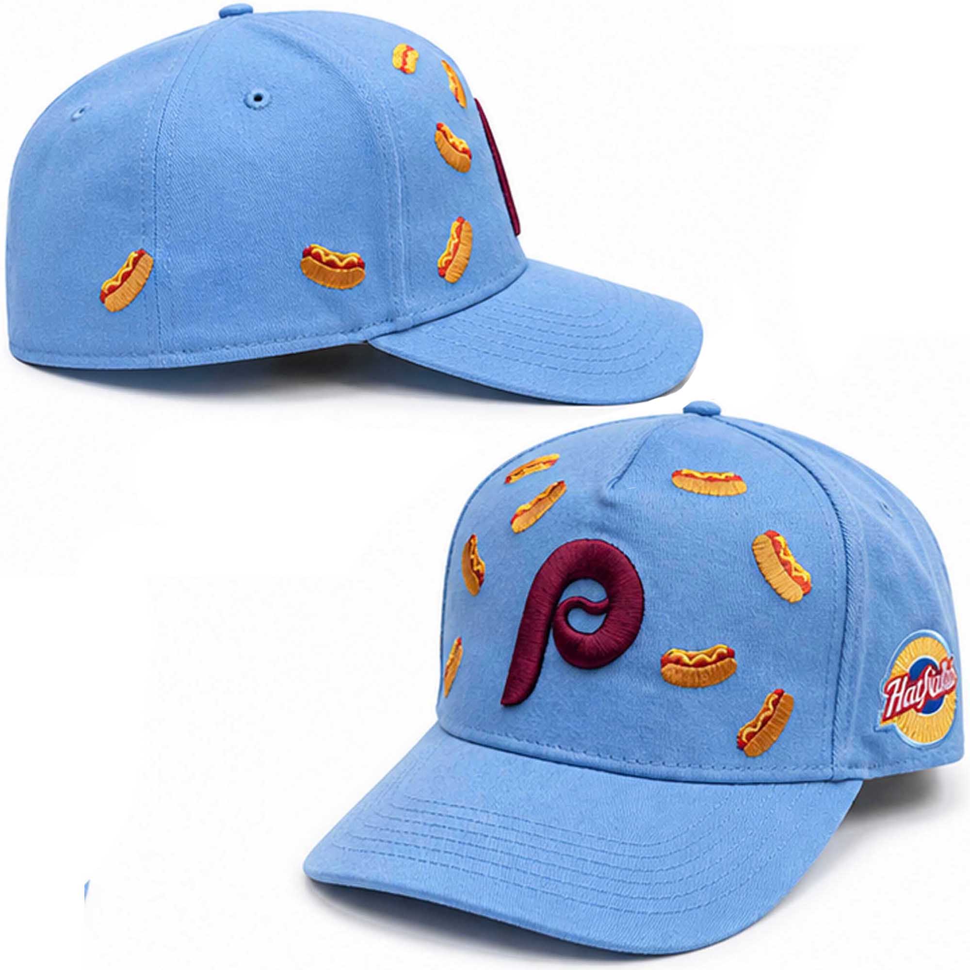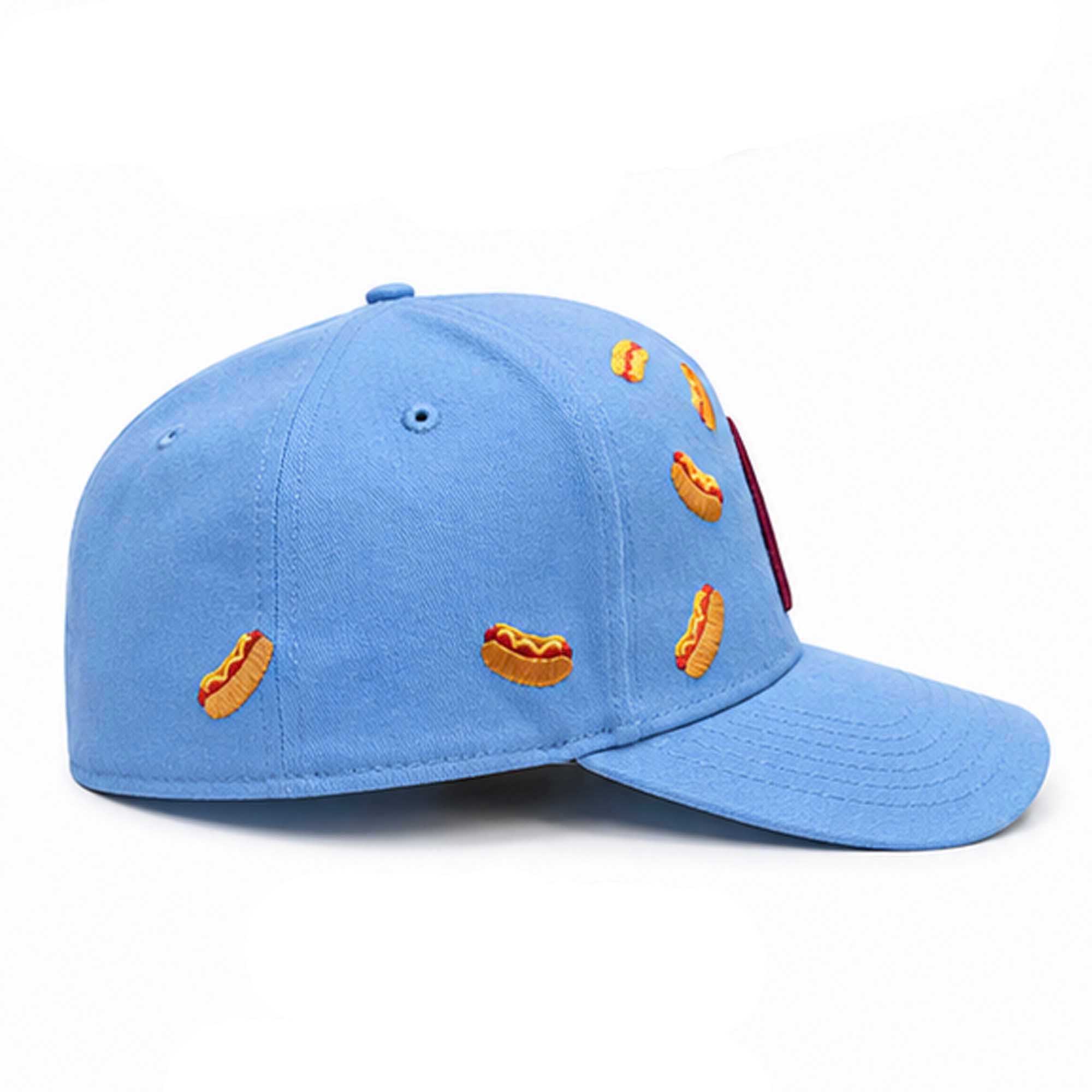 The design offers a playful atmosphere with scattered embroidered sausages on a light blue background. At the center, the Phillies-style P logo stands out, balancing team identity with humor. The bright, warm tones of the sausages add energy to the overall look without being overwhelming. The side patch highlights the party atmosphere, adding a collectible touch to the cap while maintaining a simple and easy-to-wear design.