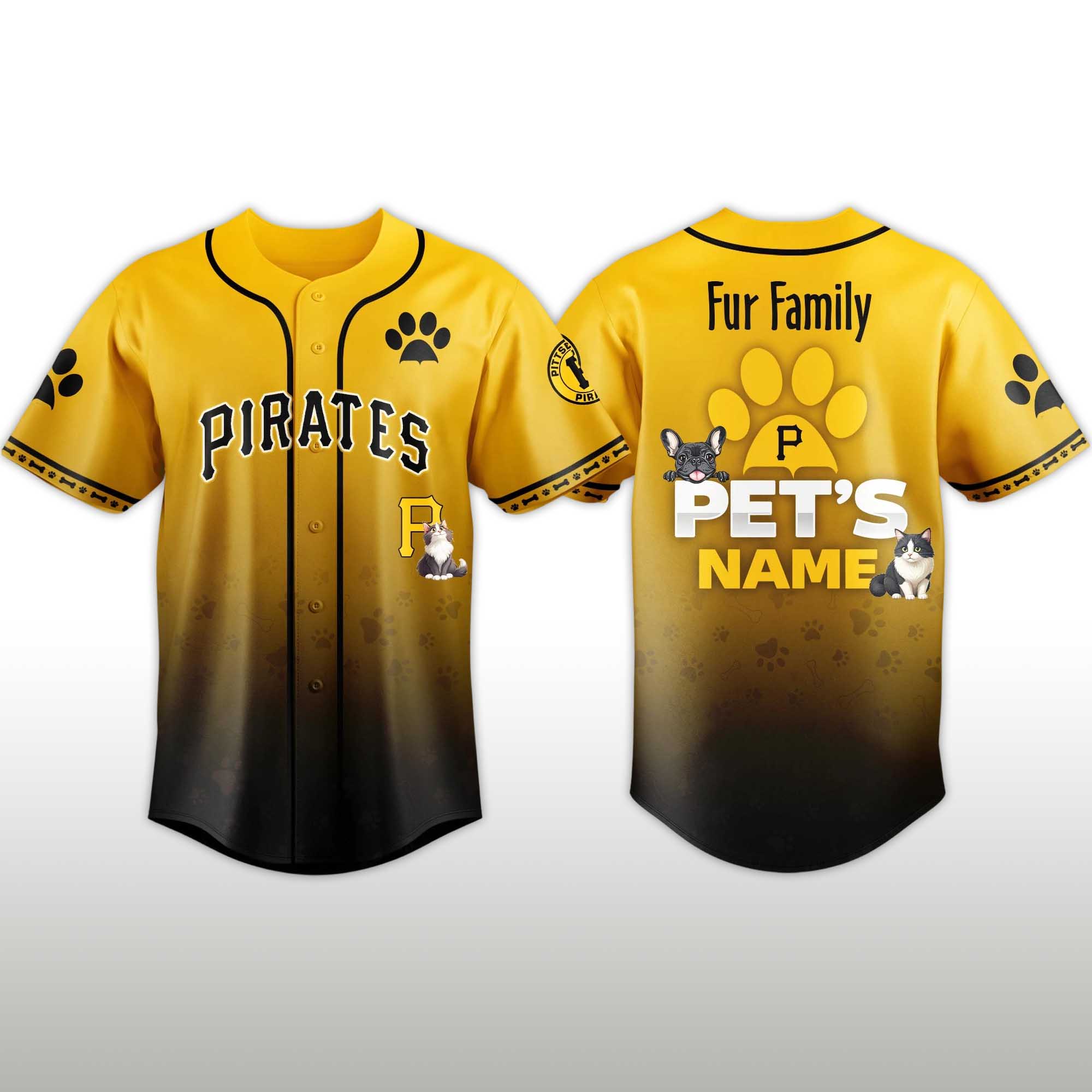The jersey features a striking yellow-to-black gradient effect, inspired by the classic Pittsburgh Pirates color palette. The front displays the familiar Pirates lettering along with the iconic P logo. Pet paw prints on the jersey create a fun, pet-celebrating theme. On the back, the Fluffy Family text appears above the customizable Pet Name, allowing fans to incorporate their beloved four-legged friend into every baseball memory.