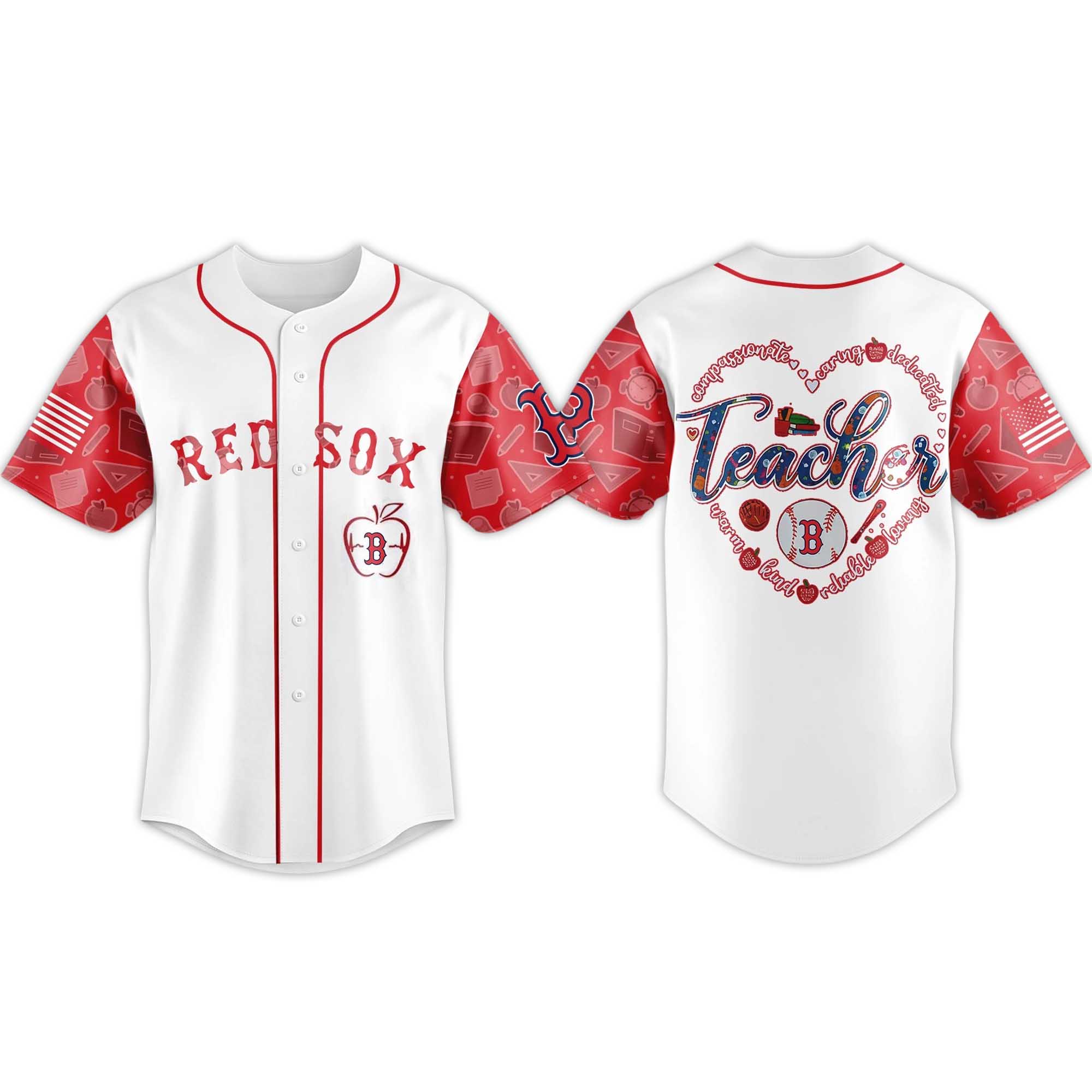 This jersey features a pristine white base contrasting with striking red trim and sleeves adorned with school-inspired motifs. The front features the classic Red Sox lettering, while the back is highlighted by a heart symbolizing Teacher, representing appreciation and unity. The combination of sporty structure and meaningful imagery creates a balanced, striking look without being overly flashy.