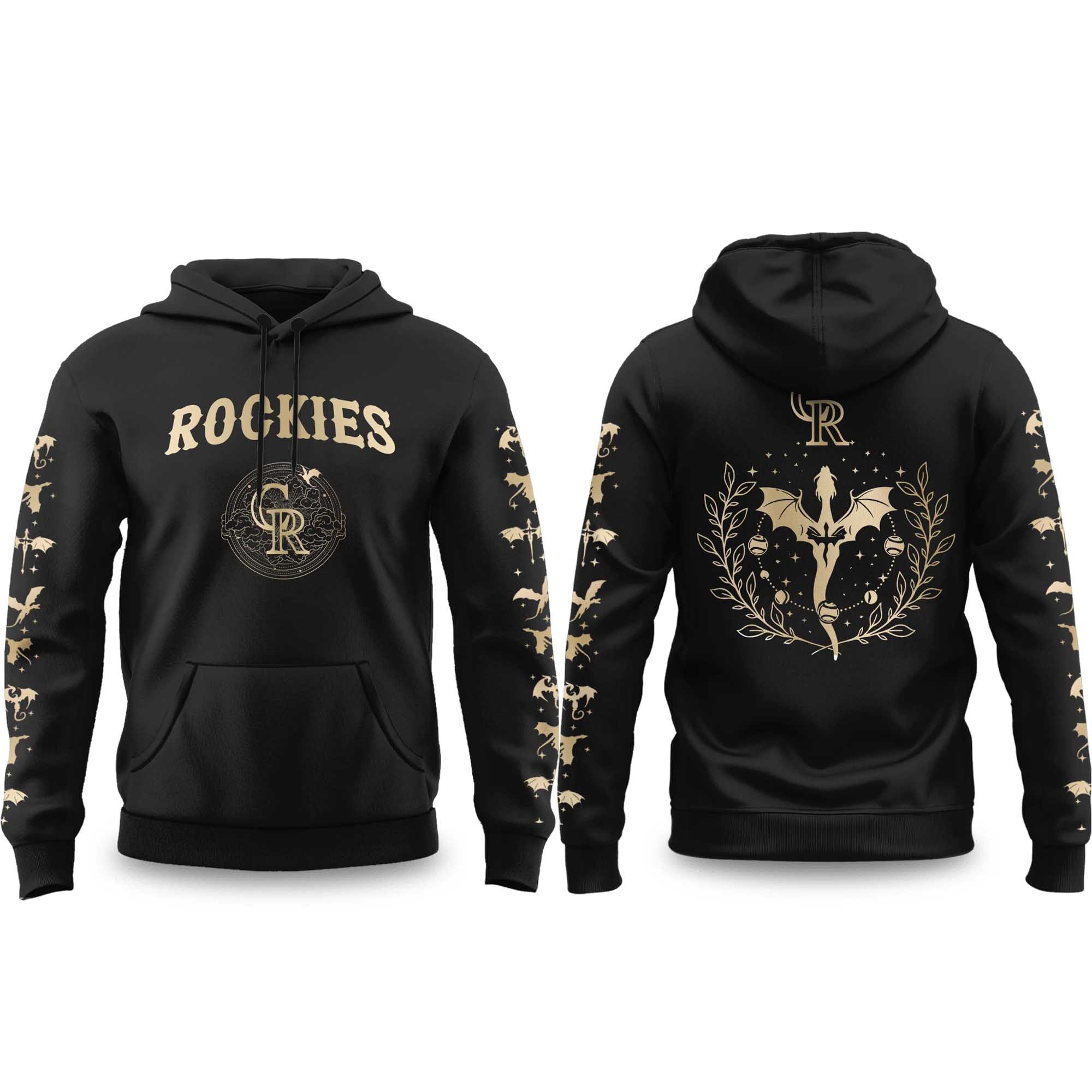 The black background creates a simple look, allowing the gold graphic to stand out clearly. The front features the word ROCKIES with a central logo for a balanced and easy-to-match feel. The back features a detailed and symmetrical wing design, surrounded by subtle decorative details for added depth. The print on the sleeves extends the look, creating a seamless feel for the hoodie from front to back.