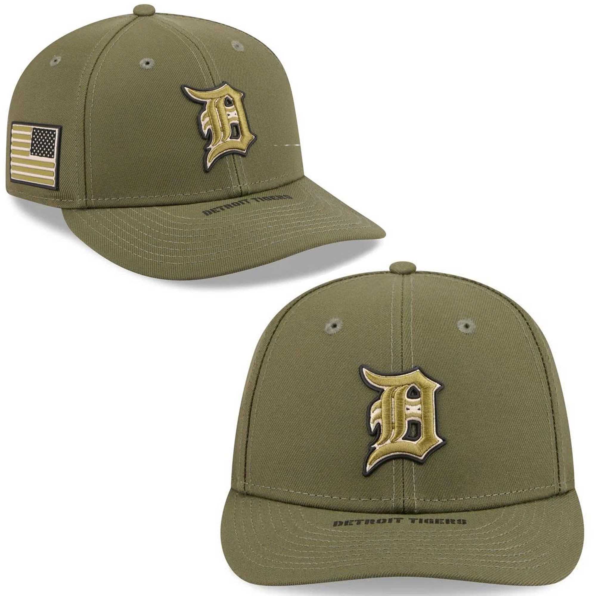 The army olive green background reflects the Armed Forces Day theme in a modern and sophisticated way. On the front, the classic British-style D logo of Detroit is embroidered in raised gold and dark trim, creating a striking contrast with the muted crown. A matching American flag patch on the side adds a patriotic touch while maintaining overall balance. The curved brim, sharp panel construction, and classic logo placement combine traditional baseball style with modern streetwear trends.