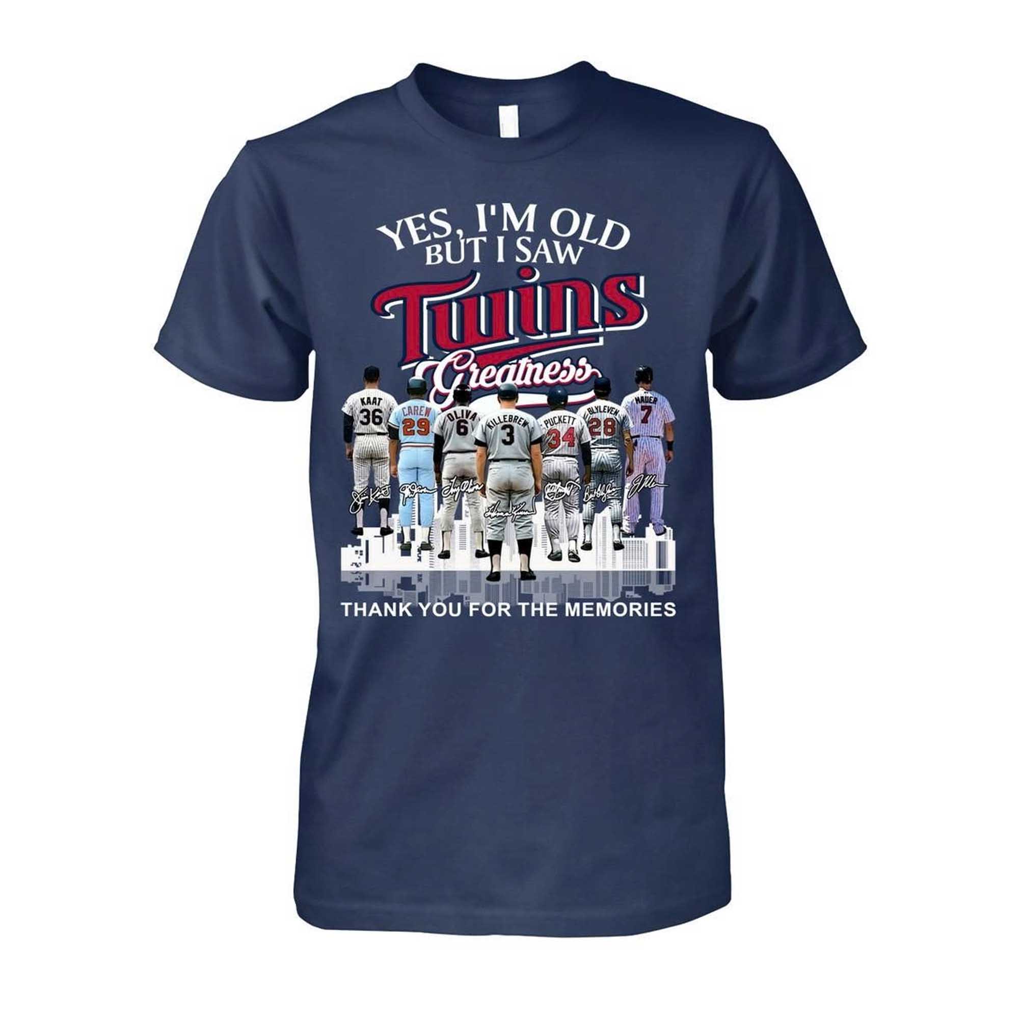 This shirt features a deep navy blue background that highlights the typography and imagery. The phrase Yes, I’m Old But I Saw Twins Greatness takes center stage, combined with images of legendary players wearing iconic numbers. The layout evokes a sense of heritage and respect, while the graphic details add depth and storytelling. The balanced composition and strong contrast make the design eye-catching without feeling overwhelming.