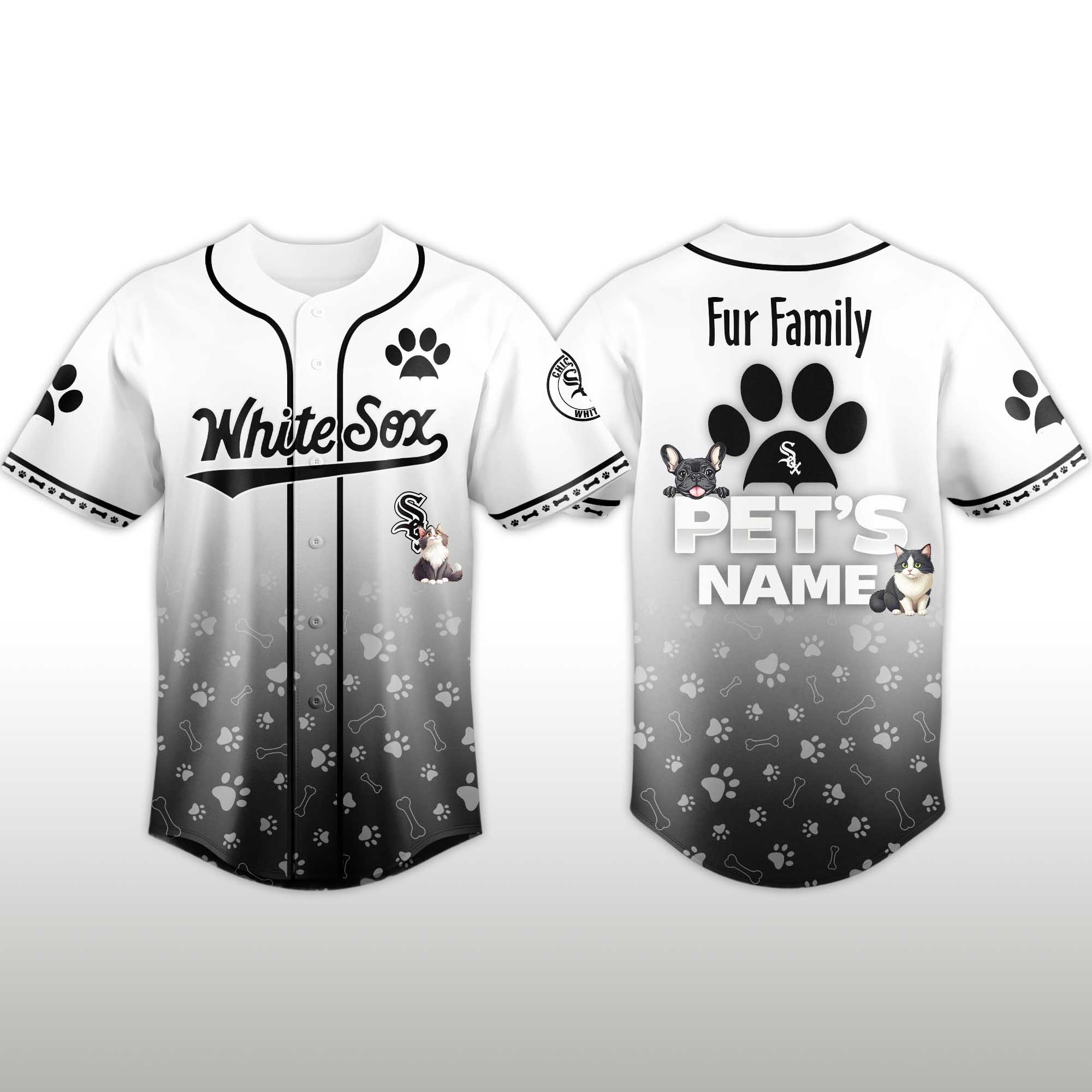 The jersey features a striking white-to-black gradient inspired by the colors of the Chicago White Sox. A footprint design spans across the bottom, symbolizing the celebration of the Pet Family. The jersey includes a customizable Pet Name section on the back, allowing fans to show off their furry friend. The classic button-down baseball style and comfortable athletic fit make it suitable for stadium events, outdoor activities, or everyday wear for fans.