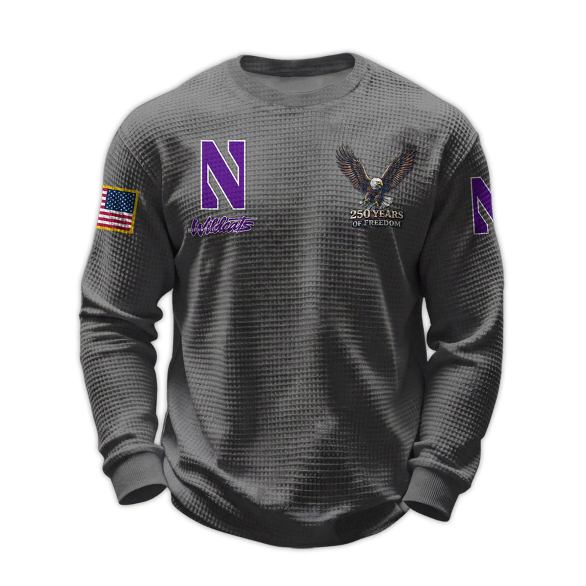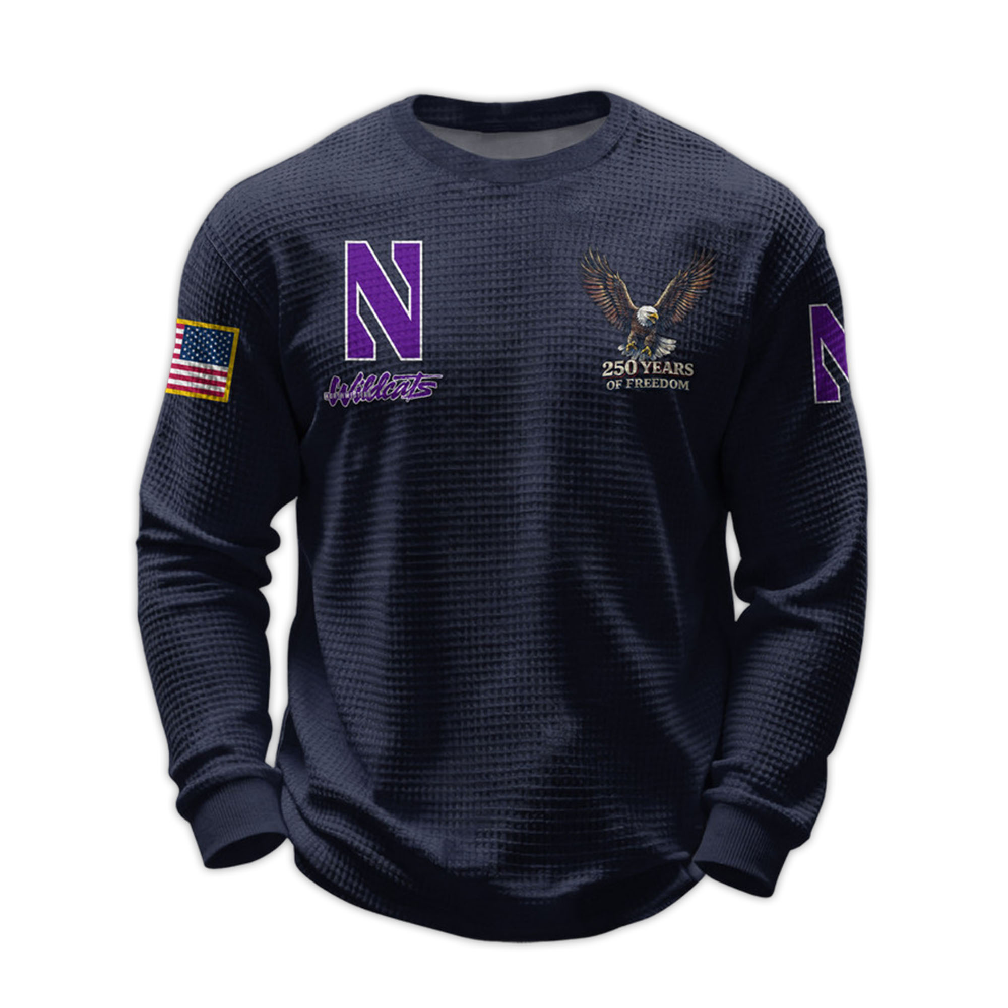 The 2026 Wildcats 250 Years Of Freedom Waffle Sweatshirt combines a clean, school-inspired look with a strong patriotic theme. Featuring the signature N logo and meticulously drawn eagle, the sweatshirt creates a balanced style that is both striking and easy to wear. The textured fabric adds depth, making the sweatshirt stand out subtly yet stylishly.