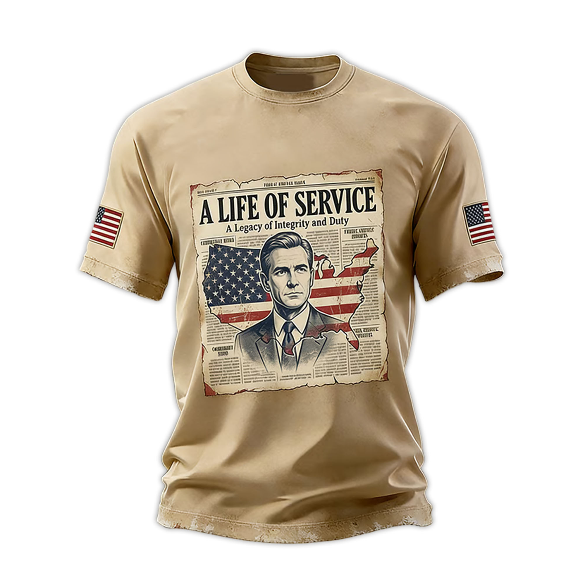 The highlight of this shirt is its vintage-inspired design, resembling the front page of a historical newspaper. The bold text A Life of Service is combined with a subtitle emphasizing integrity and responsibility. The portrait and American flag elements create a patriotic tone without being overly ostentatious. The fabric remains lightweight and comfortable, while the print retains its sharpness even after multiple uses.