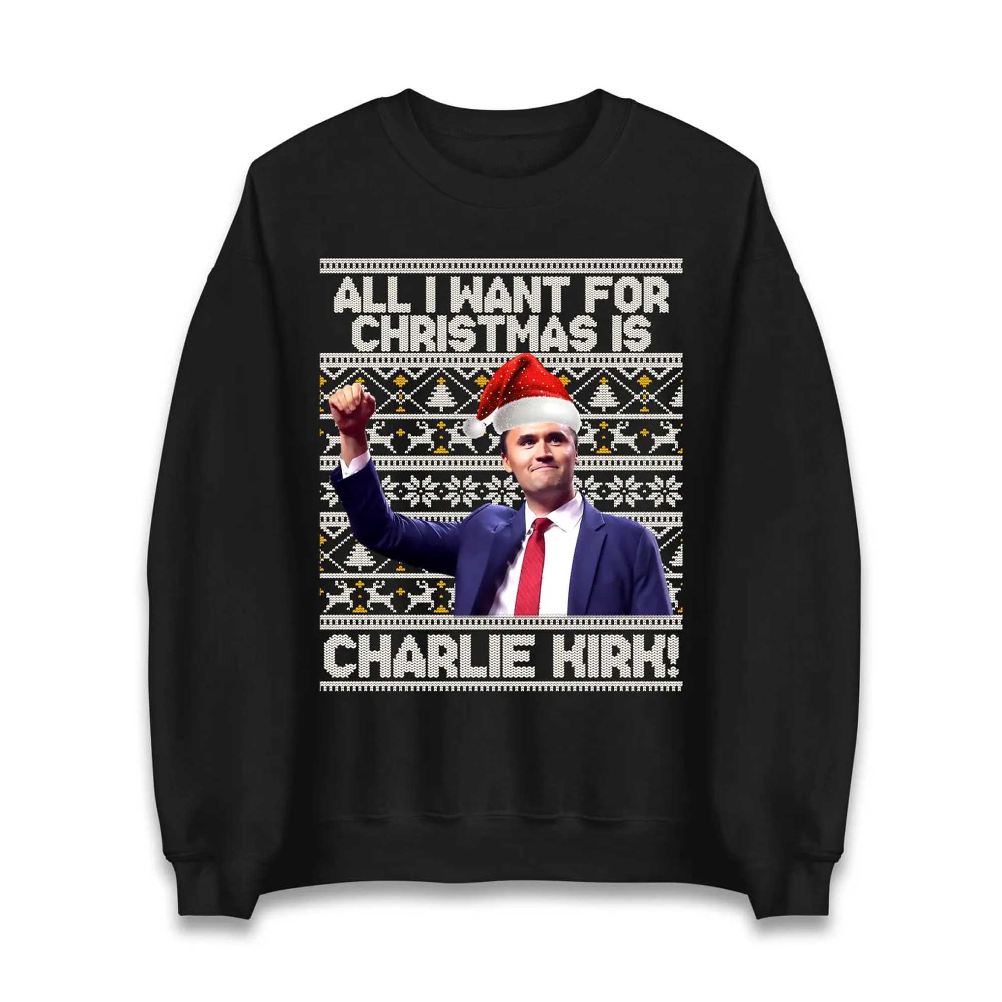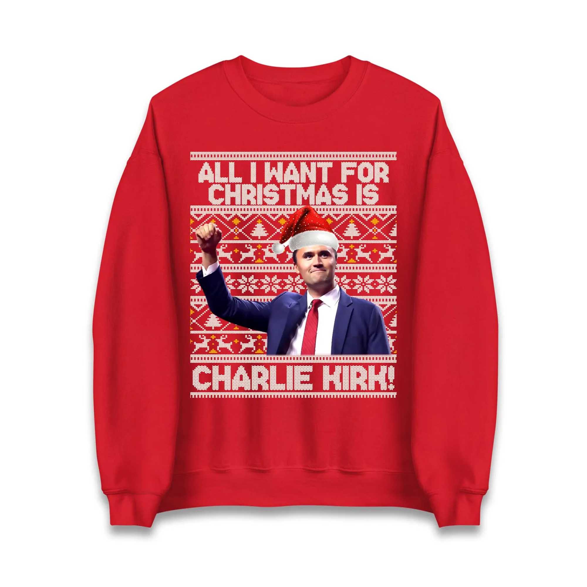 Hey freedom lovers! The All i want for Christmas is Charlie Kirk Sweatshirt is still very popular this holiday season. After the tragic 2025 shooting at Utah Valley University, the hashtag #RIPCharlieKirk and red tributes exploded. Kirk founded Turning Point USA in 1993 and mobilized young people to fight for free speech. This sweatshirt says it all: his image—arms raised, Santa hat, vest—paired with the words “All I Want for Christmas is Charlie Kirk” in white. Red snowflake trim, soft flannel, sizes S-3XL, pre-shrunk. Great for MAGA meetings or the holiday season.