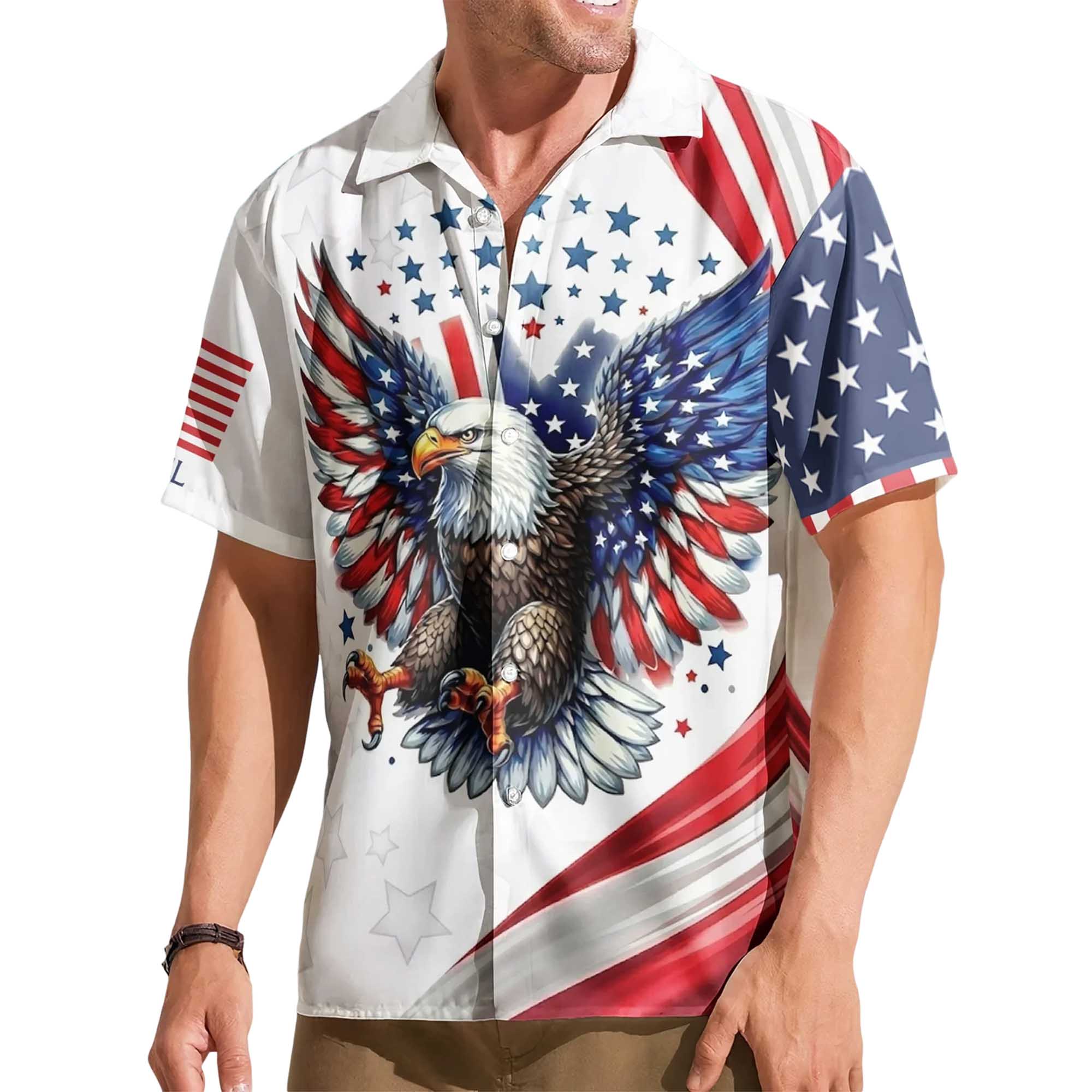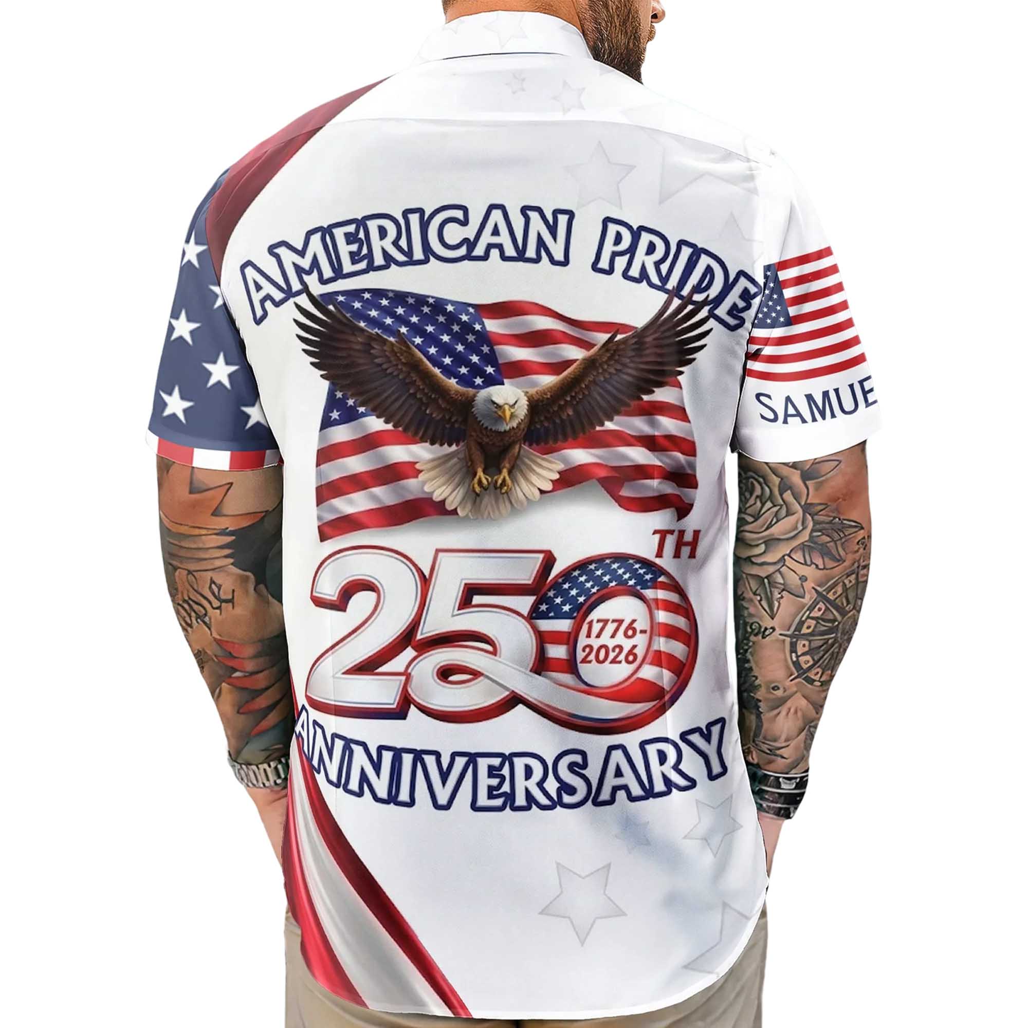 This shirt draws inspiration from American heritage, national unity, and symbols most closely associated with freedom and strength. The bald eagle symbolizes courage and independence, while the stars and stripes reflect national identity. The 250th Anniversary message celebrates two and a half centuries of history, development, and shared traditions. The combination of these elements with the Hawaiian shirt style creates a playful look, perfect for festivities.