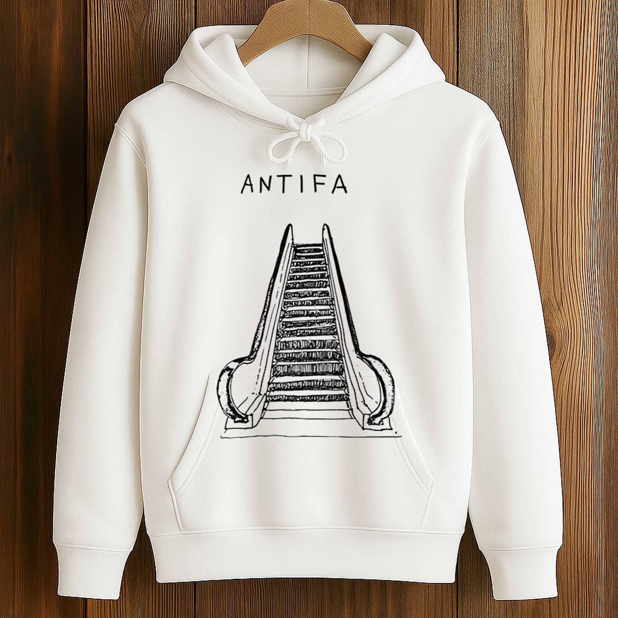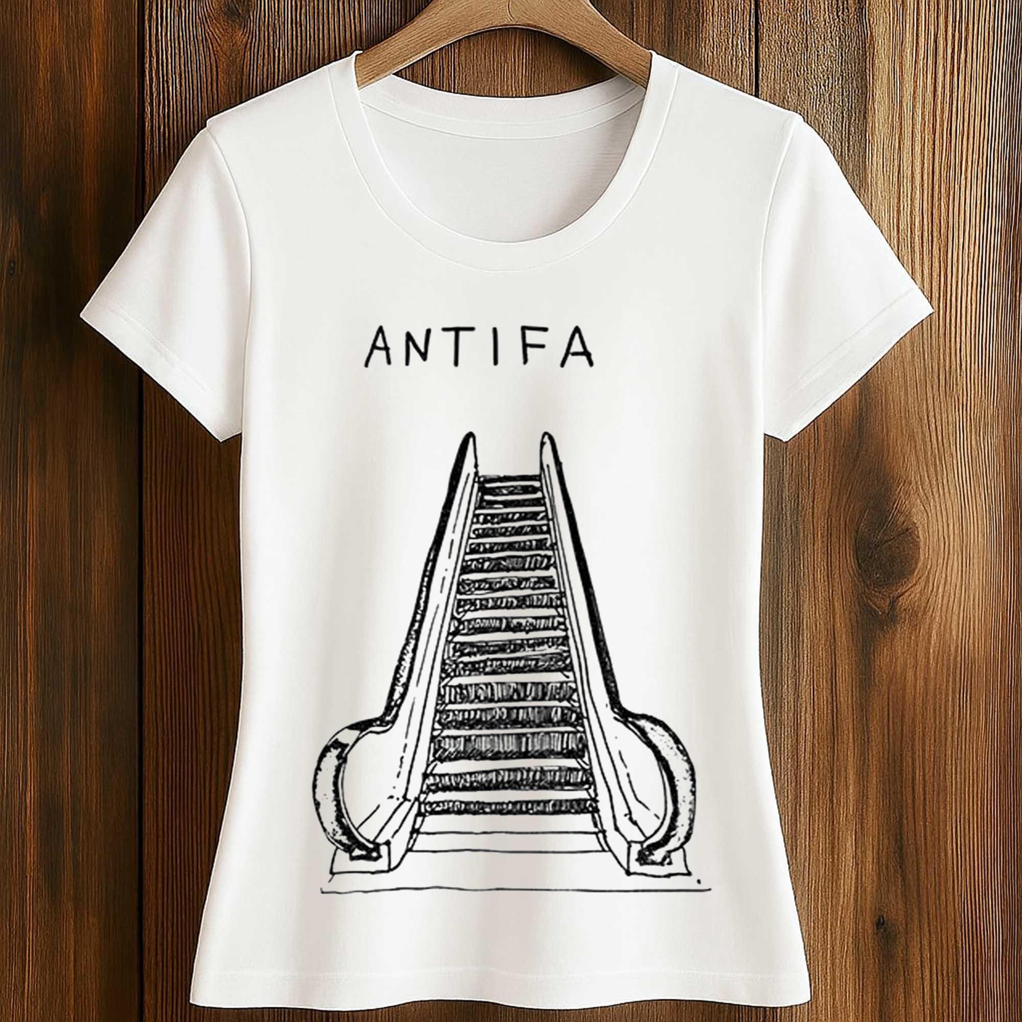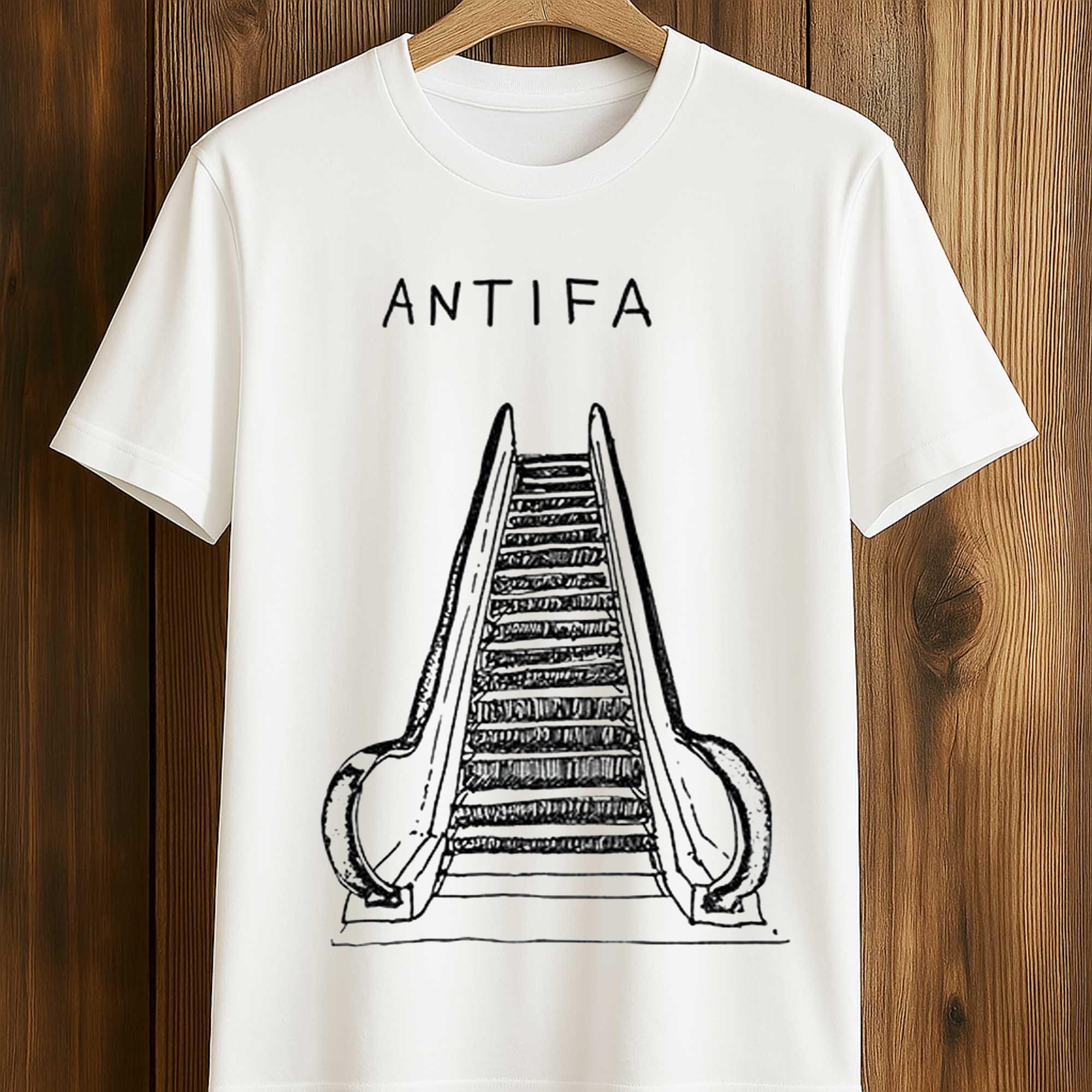 This shirt features a crisp white body with the words “ANTIFA” printed above a hand-drawn escalator illustration. The design is intentionally minimalist, using sharp black lines to create a striking contrast against the white fabric. This minimalist style makes the shirt versatile and easy to style, while the hint of humor hidden in the design also helps the shirt stand out. Made from a breathable cotton blend, the shirt is comfortable for everyday wear and holds its shape through multiple washes.