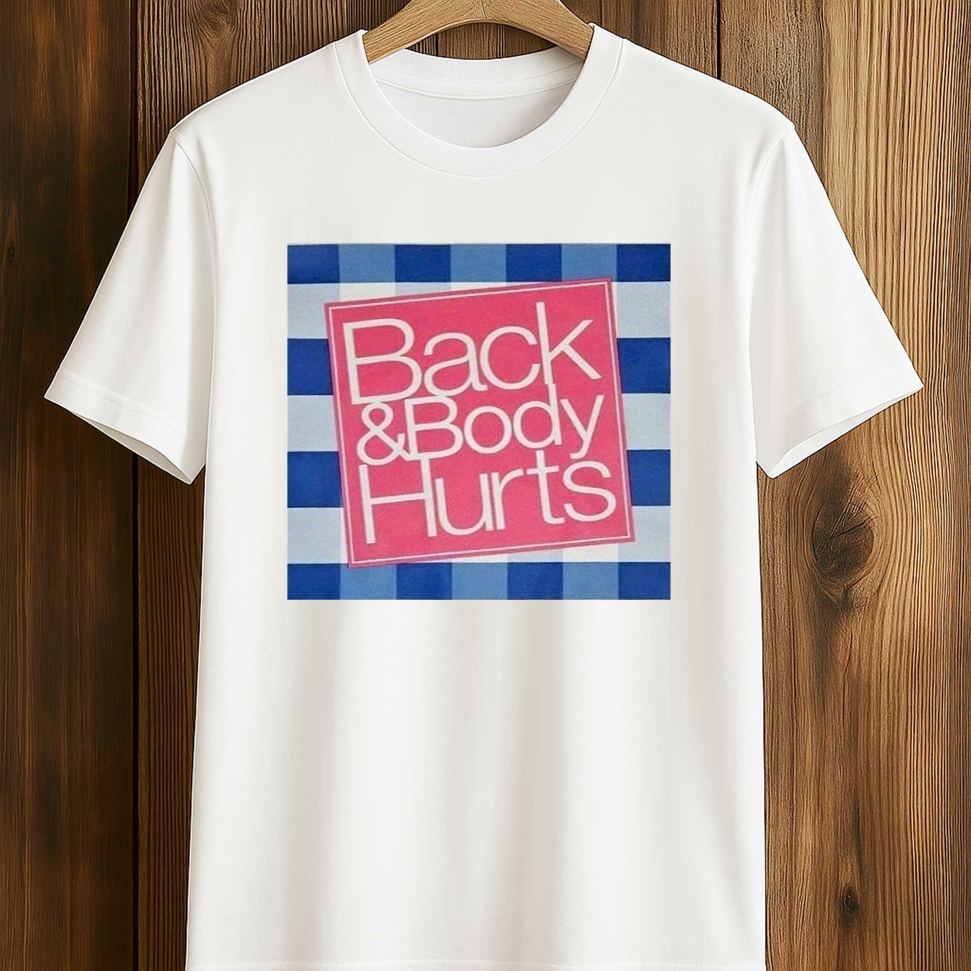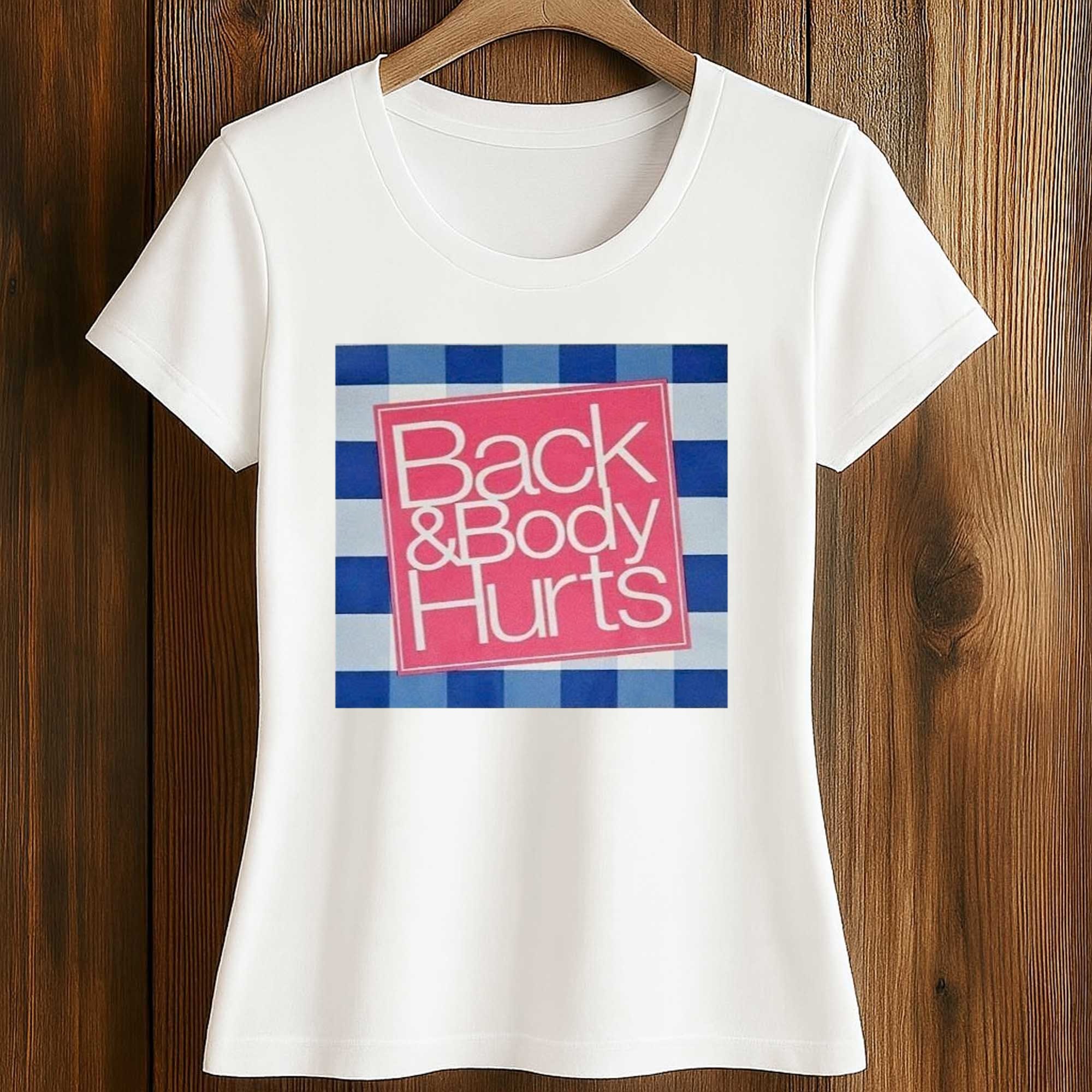 The design features a bold square with a modern, clean layout. A vibrant pink center highlights the words Back & Body Hurts, surrounded by a blue checkered border for added contrast and visual depth. The large, easy-to-read print creates a strong presence without feeling overwhelming. The combination of color and structure creates a balanced, striking yet easy-to-style look.