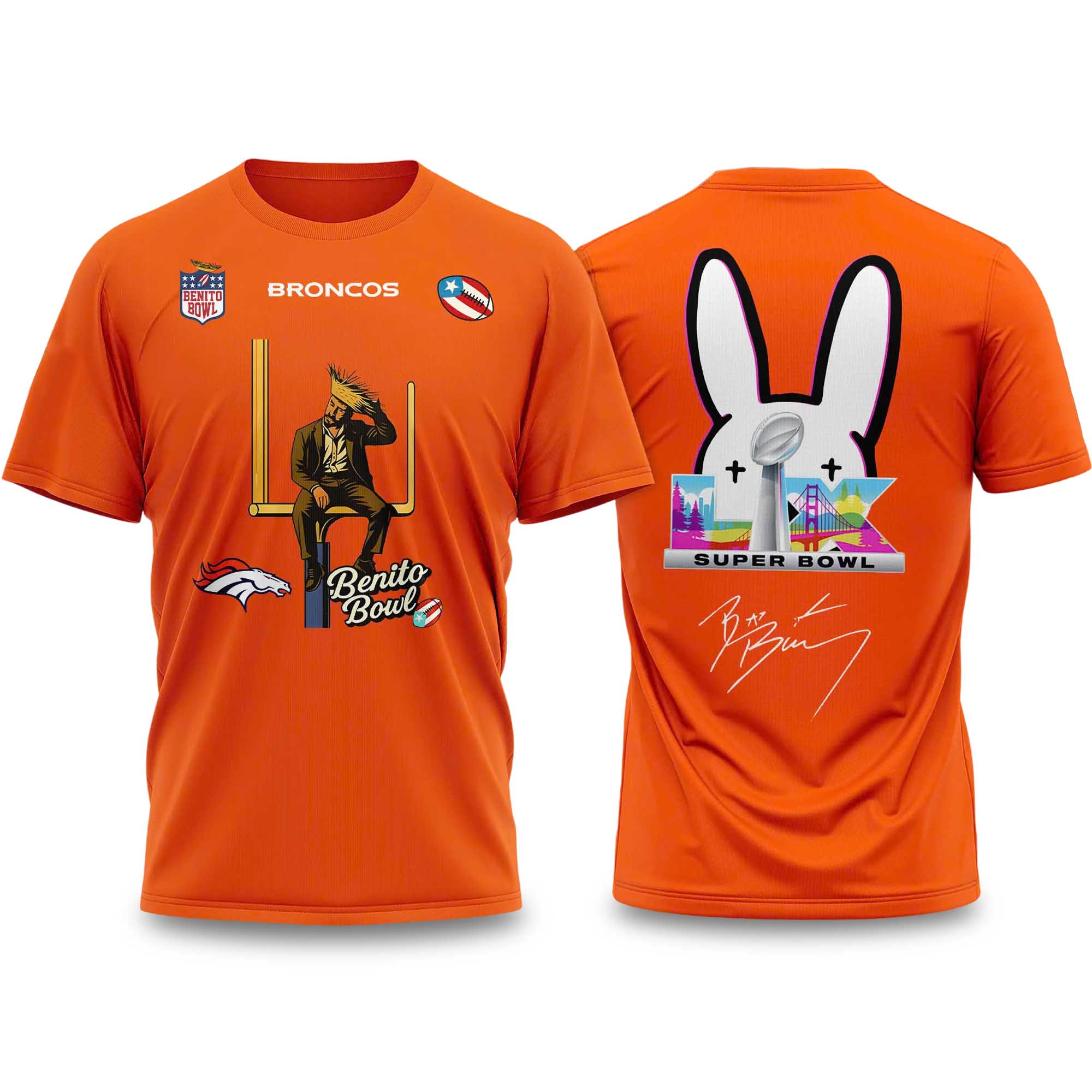 The Bad Bunny 2026 Broncos Bowl LX Halftime Show Shirt perfectly embodies that fusion. The Broncos’ bright orange color instantly grabs attention, while the artistic imagery reflects the creativity of the halftime show. This shirt is for fans who love soccer culture but also care about music fashion.
