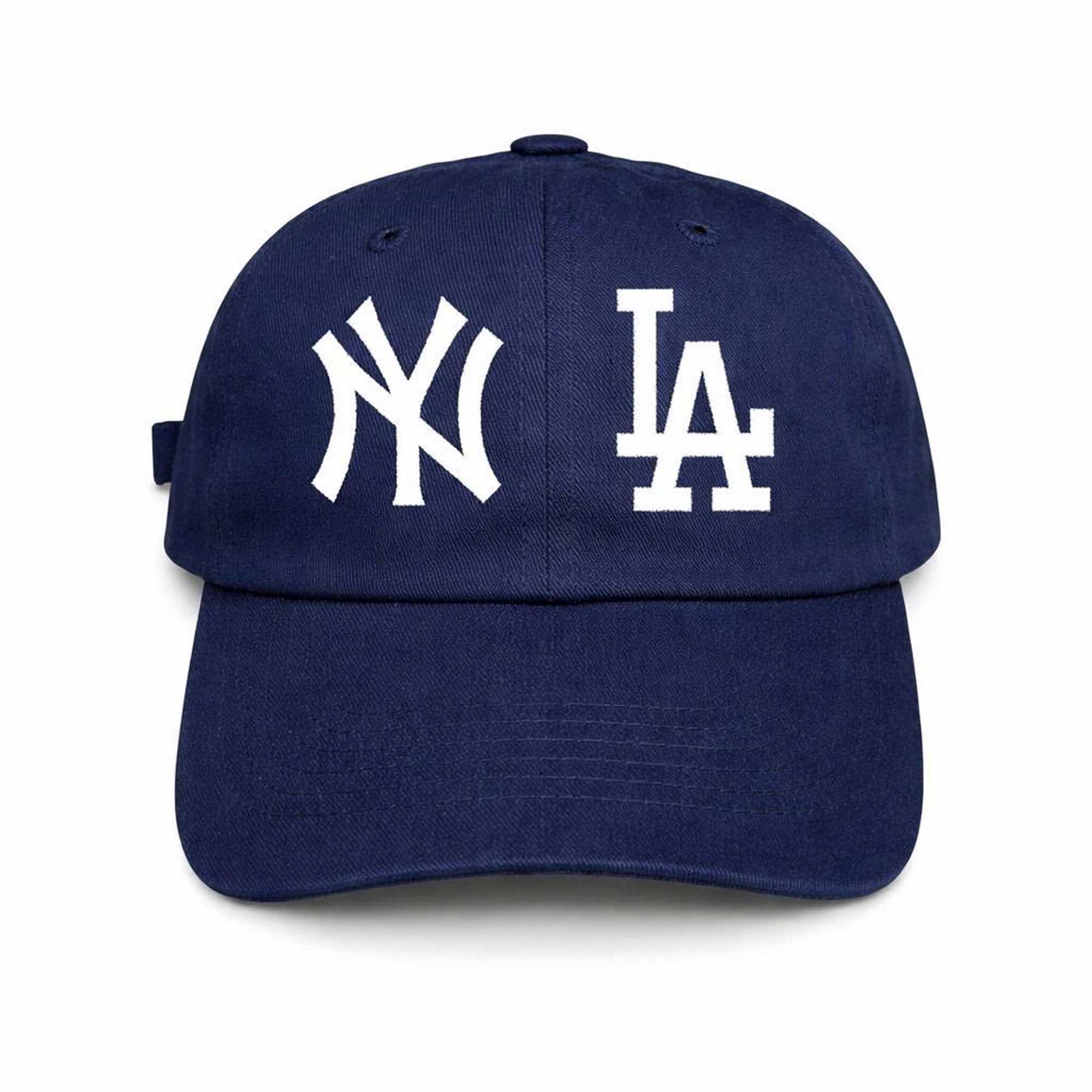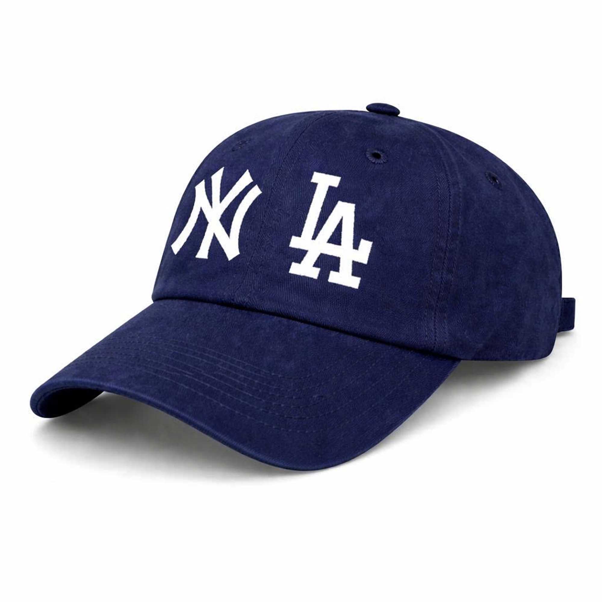 This cap features a deep navy blue color with a striking front design incorporating the classic NY and LA logos. The embroidery stands out in pristine white, creating a sharp contrast that is both modern and timeless. Made with breathable fabric, it offers all-day comfort while maintaining its shape. An adjustable strap at the back ensures a secure and flexible fit, accommodating a variety of head sizes and styles.
