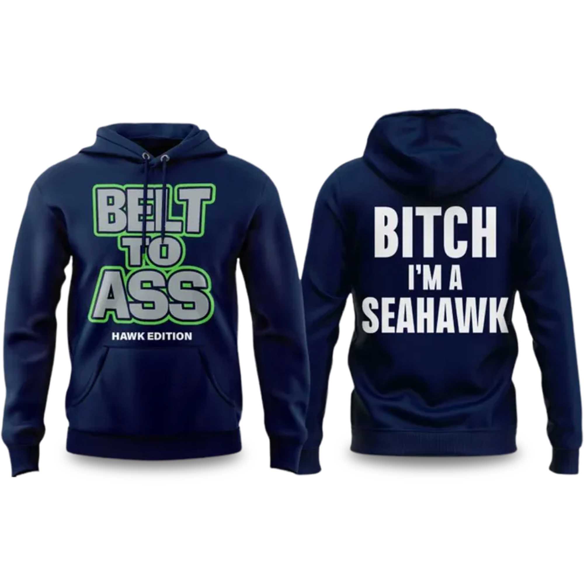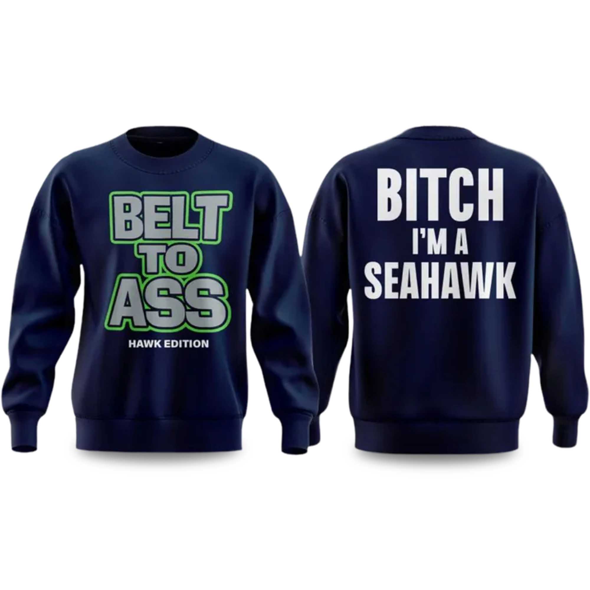 This shirt features a striking reversible design that makes an instant impression. The front reads “Belt to Ass – Hawk Edition,” while the back delivers the unforgettable phrase “Bitch I’m A Seahawk.” The fabric is soft, holds its shape well, and is easy to wear all day, whether you’re watching a game or hanging out with friends.