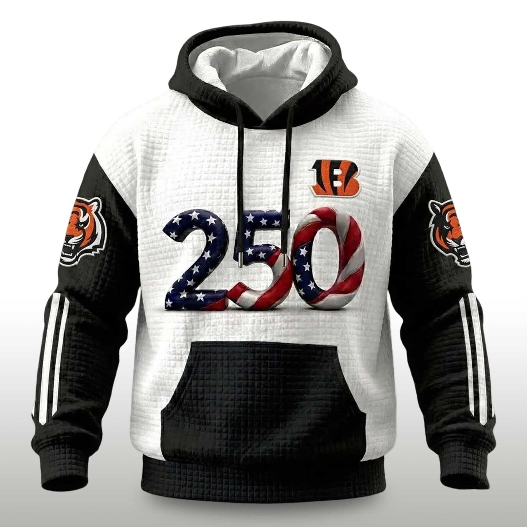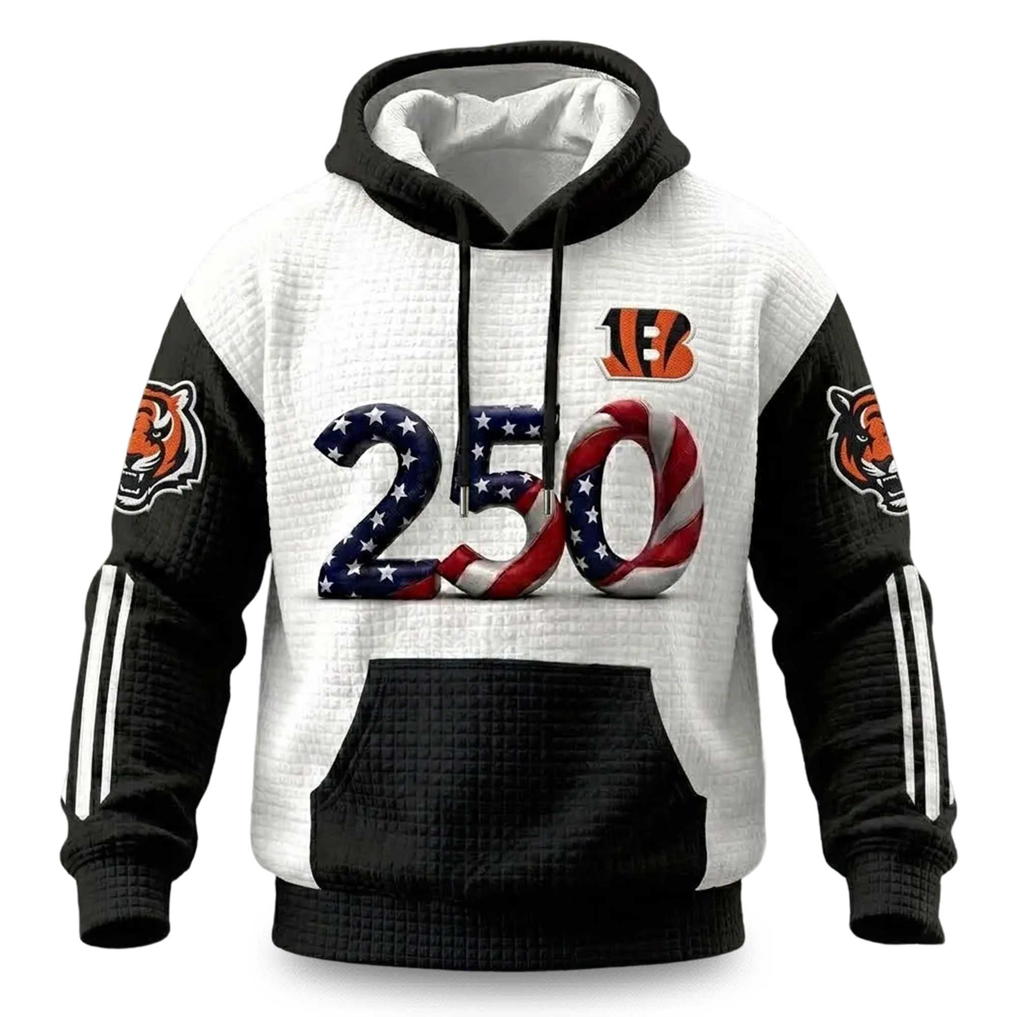 The Bengals America’s 250th Anniversary Waffle Hoodie is designed for fans who want bold style with deeper meaning. Created to celebrate the upcoming 250th anniversary of the Bengals, this hoodie combines patriotic symbolism with the unmistakable identity of the Cincinnati Bengals. Featuring a star and 250 stripe at the center, sharp contrasting black panels, and team logo details, it embodies the spirit of a major national celebration while also showing loyalty to one of football’s most exciting teams.