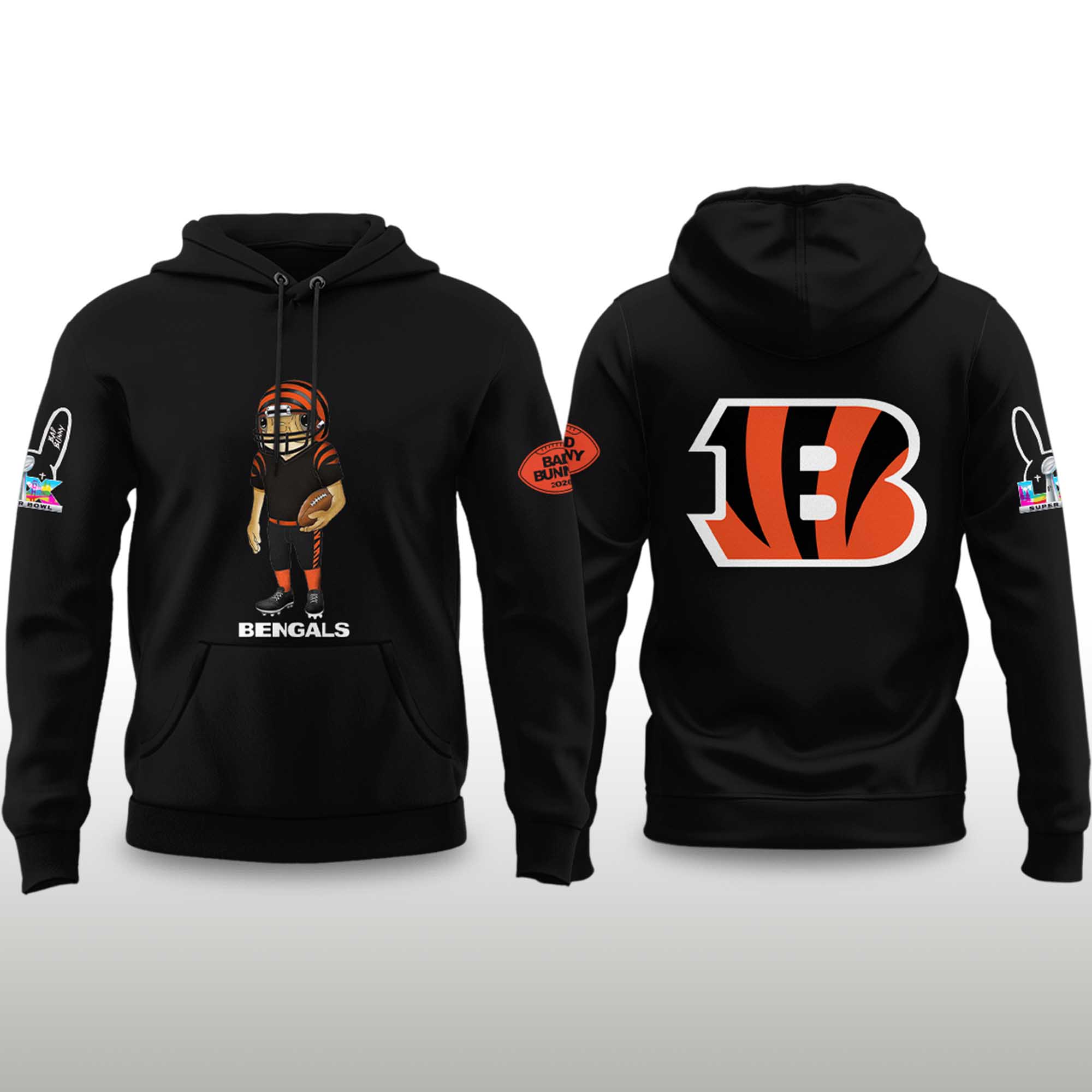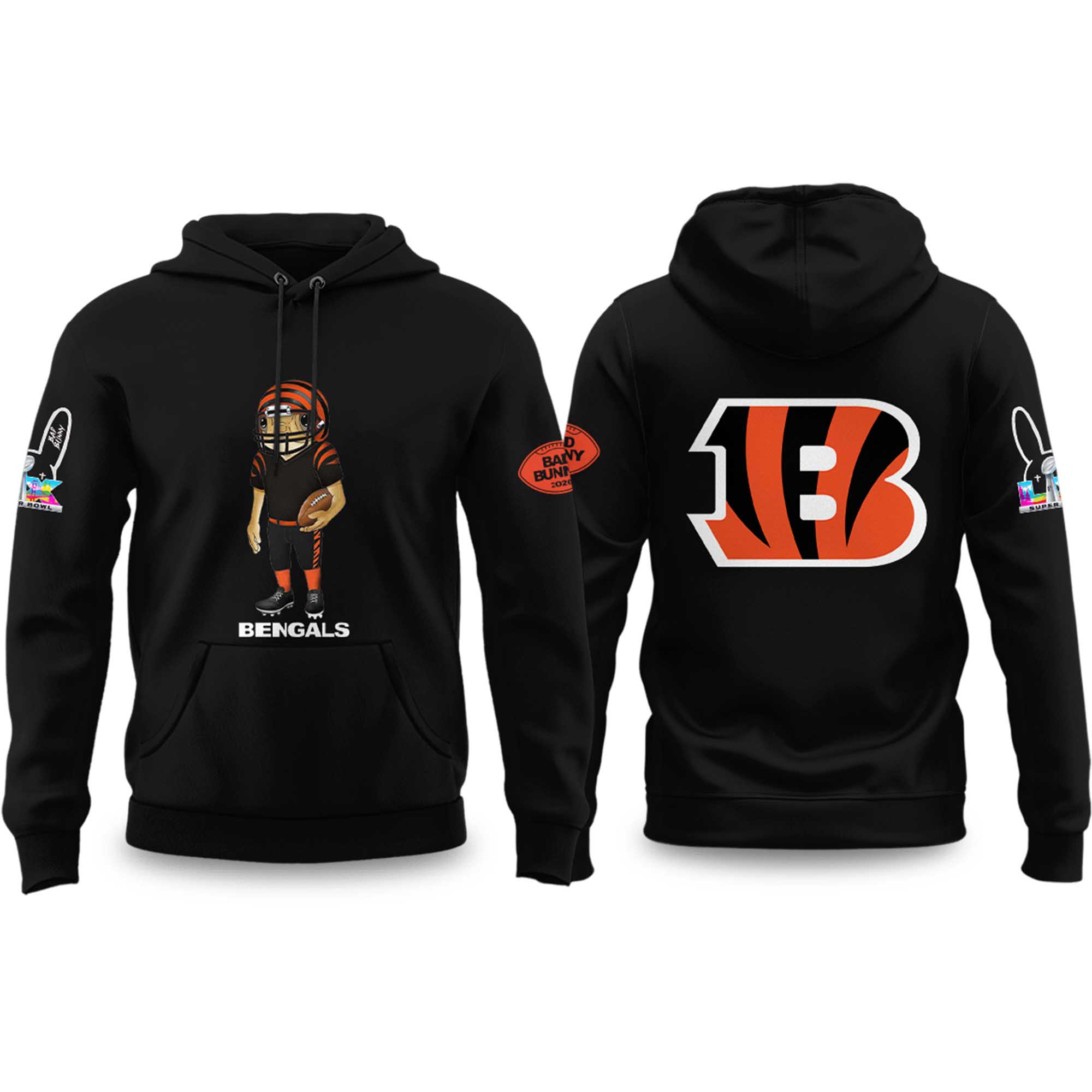 The Bengals Bad Bunny 2026 Super Bowl Concho Football Hoodie soccer hoodie features a clean black background, highlighting bold orange and white details. The front displays a playful soccer character in Bengals attire, bringing energy and personality. The back showcases the iconic “B” logo, easily recognizable to fans. The overall design is well-balanced, eye-catching, and versatile for various occasions.