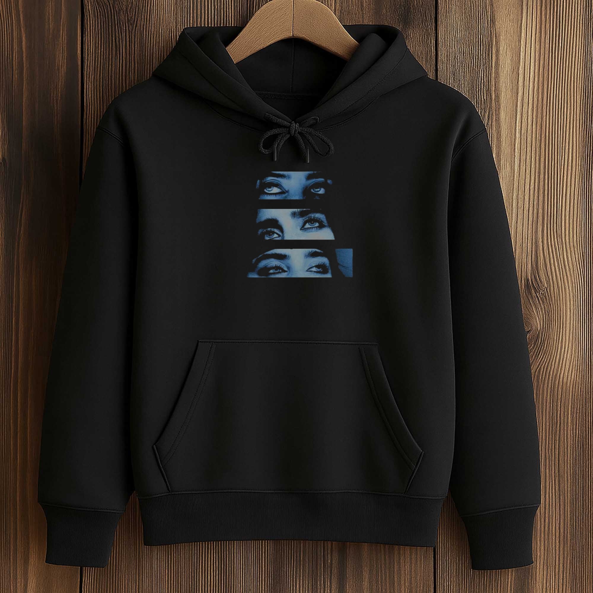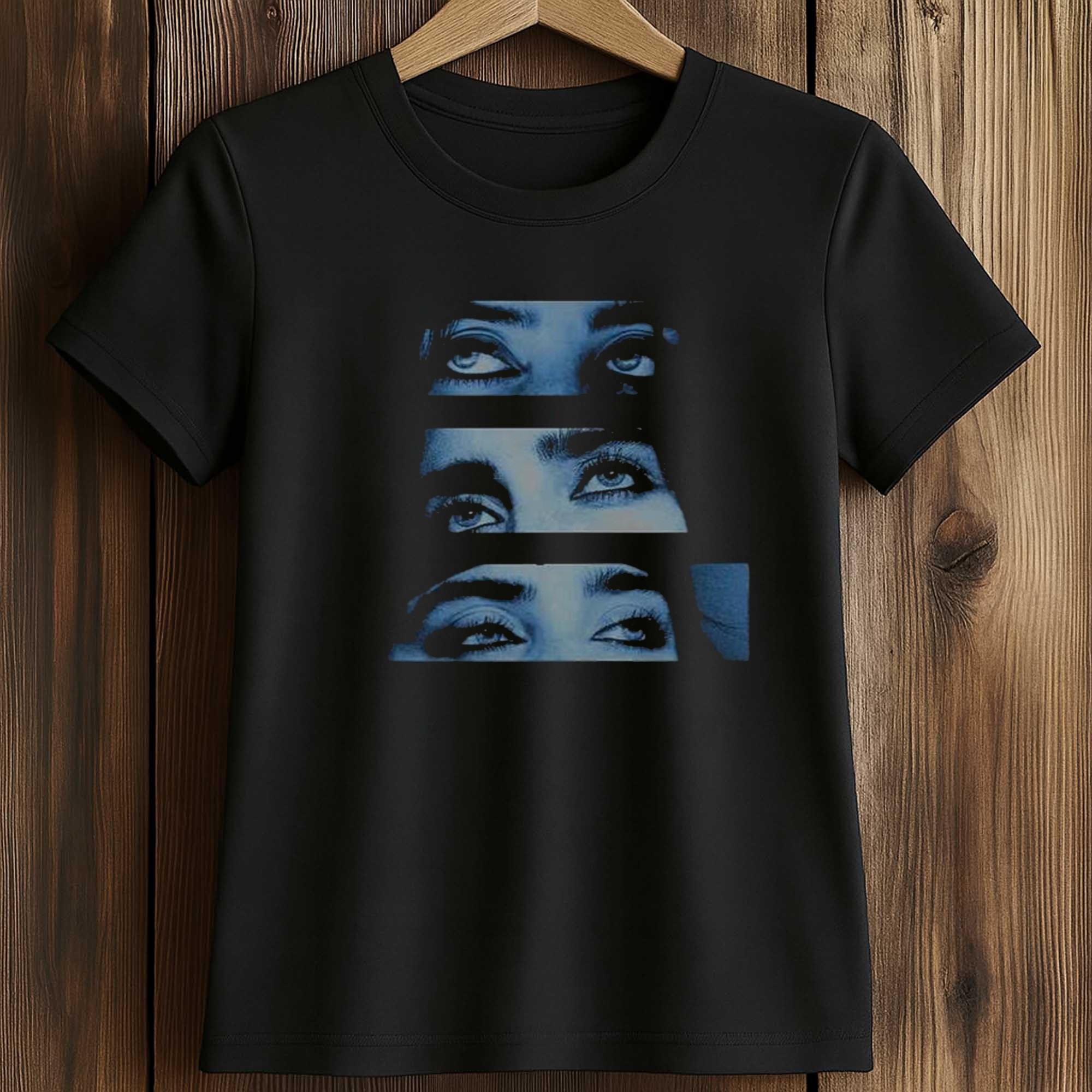 The striking design features multiple cut-out eye images stacked vertically, creating a multi-layered 3D effect that instantly catches the eye. The cool color palette stands out against the dark background, giving the shirt a bold and somewhat mysterious look. Clean lines and sharp details enhance the overall visual effect, making it a strong focal point for any everyday outfit.