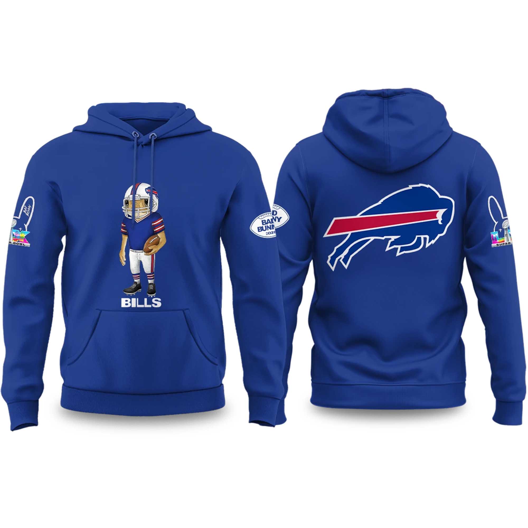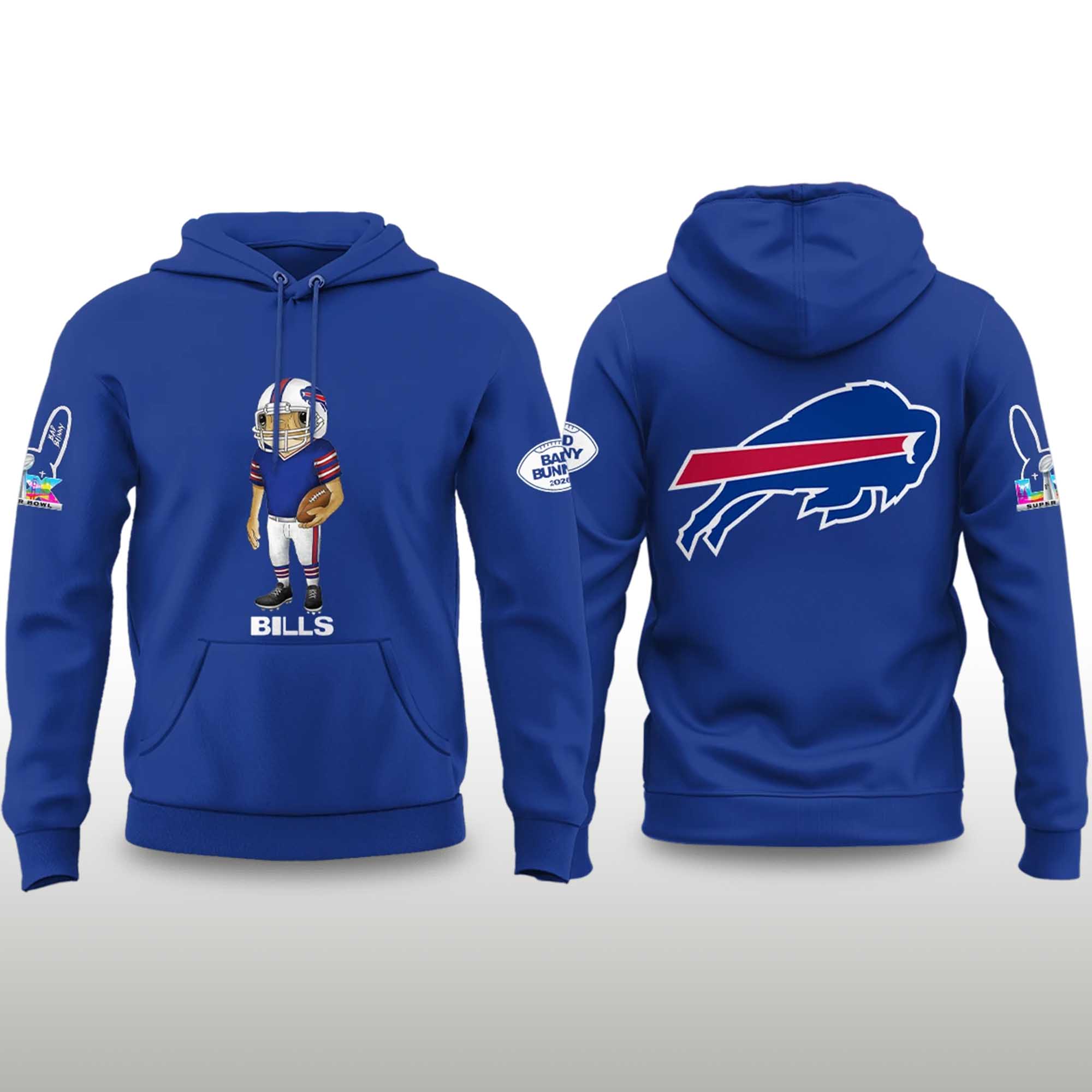 The Bills Bad Bunny 2026 Super Bowl Concho Football Hoodie combines team identity with creative illustration. The front features a fun soccer character in Bills’ colorful outfit, adding personality and dynamism. The back has the iconic Bills logo, clear and bold, standing out against a vibrant blue background.