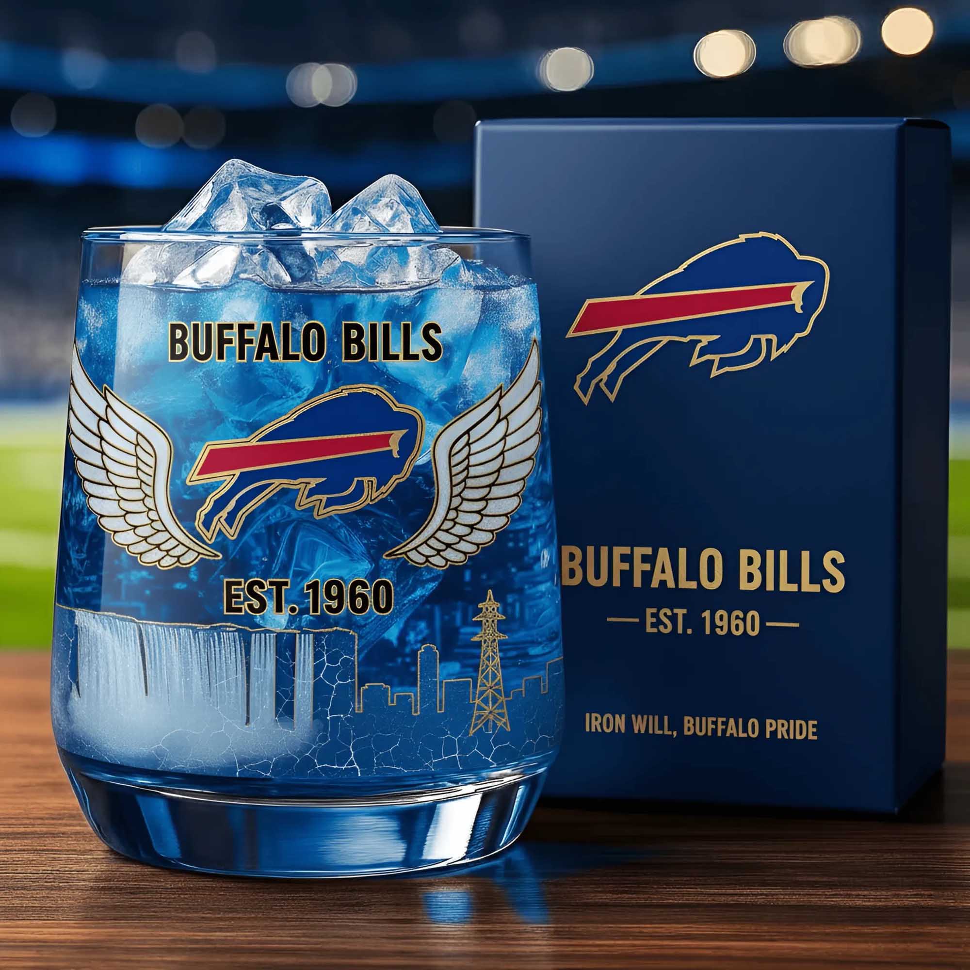 The Bills EST 1960 Iron Will, Buffalo Pride Whiskey Glass powerfully showcases the heritage of the Buffalo Bills team. The glass features a deep electric blue color, a winged buffalo emblem, and city-inspired motifs, reflecting the resilience, unity, and unmistakable identity of Buffalo football culture.