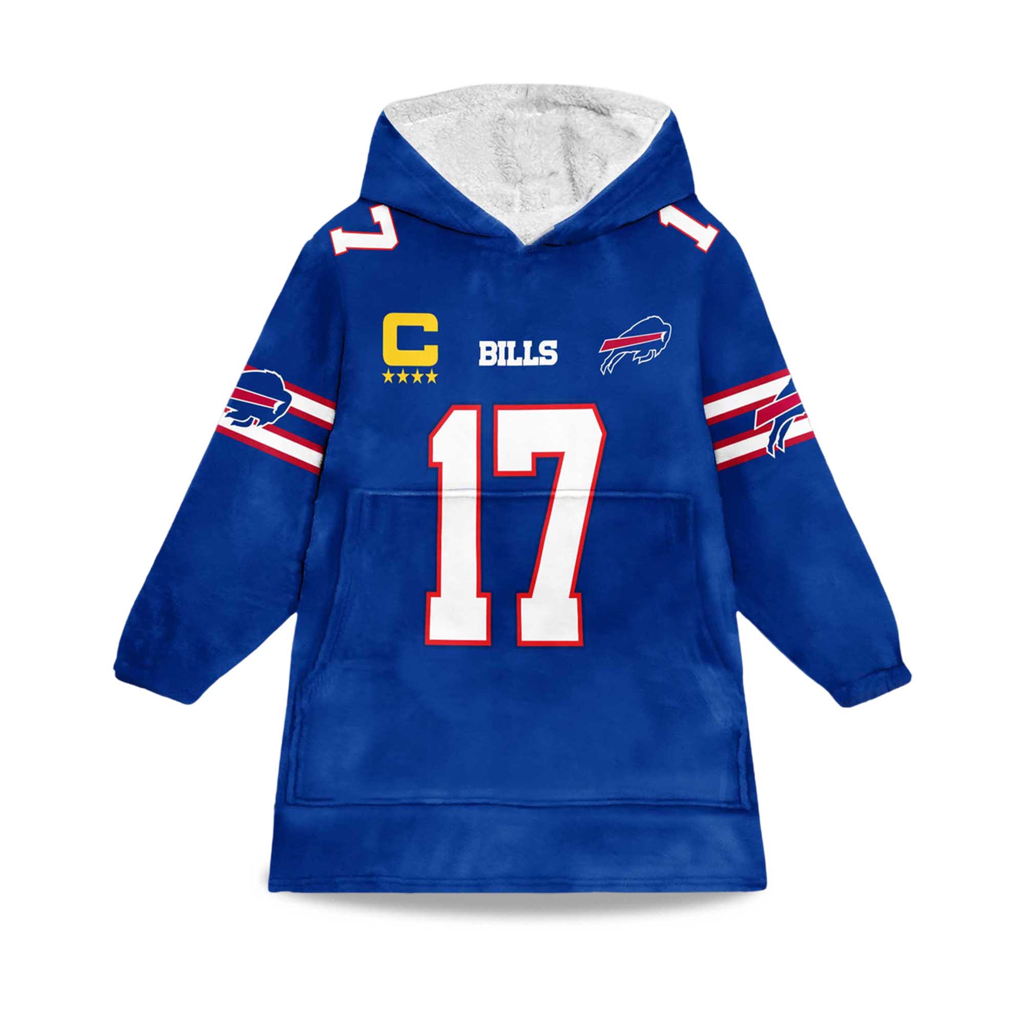 The front features Allen’s signature number 17 in a striking red-and-white color scheme, while the Bills logo and captain’s patch on the chest create an authentic on-field look. The sleeves are decorated with stripes and team logos, providing a sporty touch that matches the team uniform. The oversized blanket hugs the body, while the cozy hood provides warmth. It’s the perfect combination of cheerleading gear and ultimate comfort.