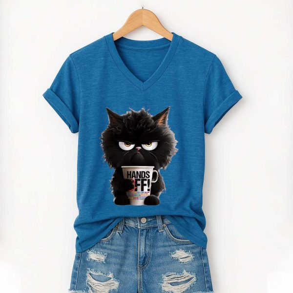 The shirt features an adorable illustration of a fluffy black cat holding a mug that reads “Hands Off!” The cat’s mischievous expression adds a fun, rebellious touch. Printed on a crisp white background, the design stands out, making it a standout addition to any wardrobe. The relaxed fit and short sleeves ensure a casual yet stylish look.