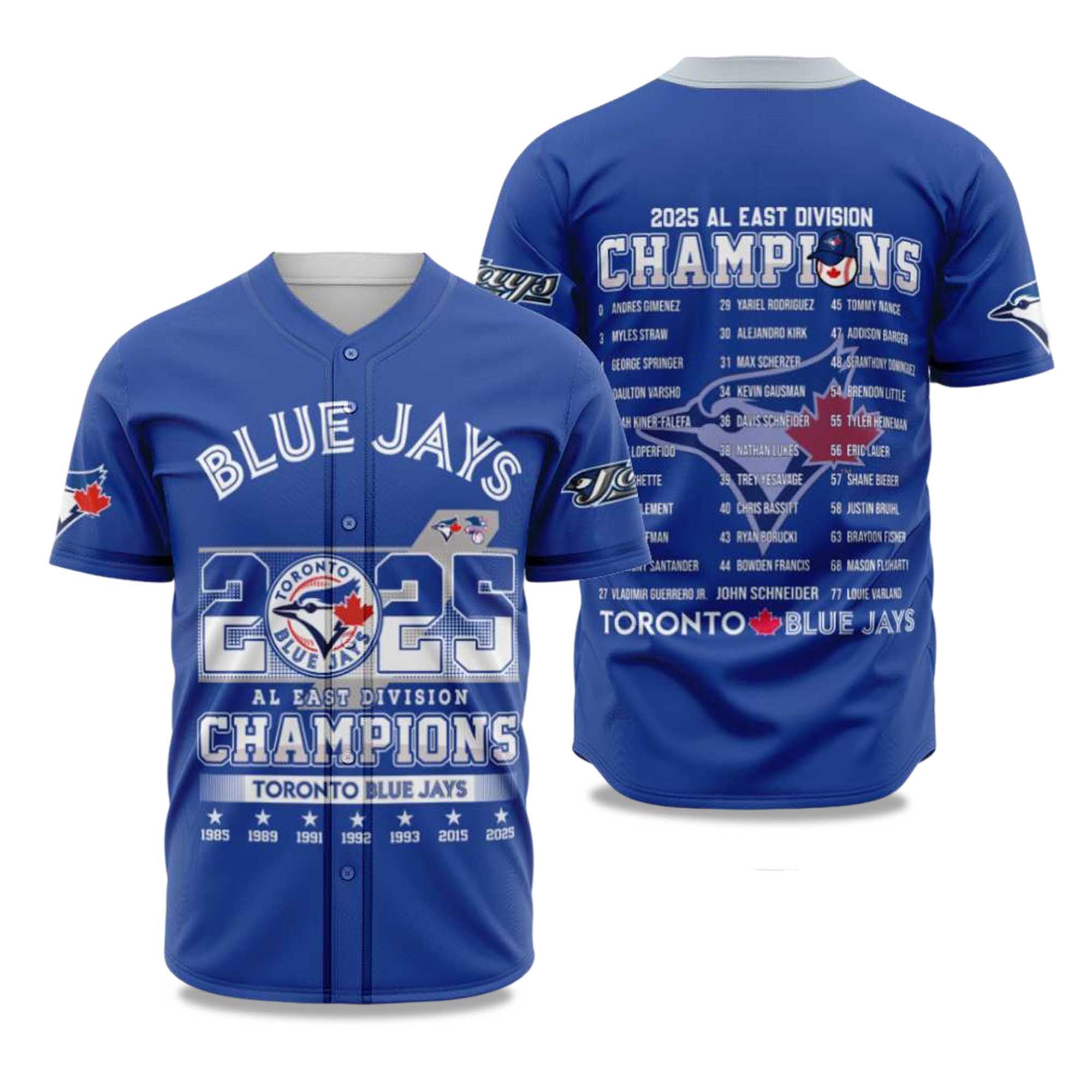 The front features the iconic Blue Jays logo surrounded by bold “2025 AL East Division Champions” text with white and silver accents. The back features a roster of players and coaches, along with a portrait of the championship team. The deep royal blue color, front button closure, and high-quality print provide a true-to-the-field feel, making this jersey a standout in any fan’s collection.