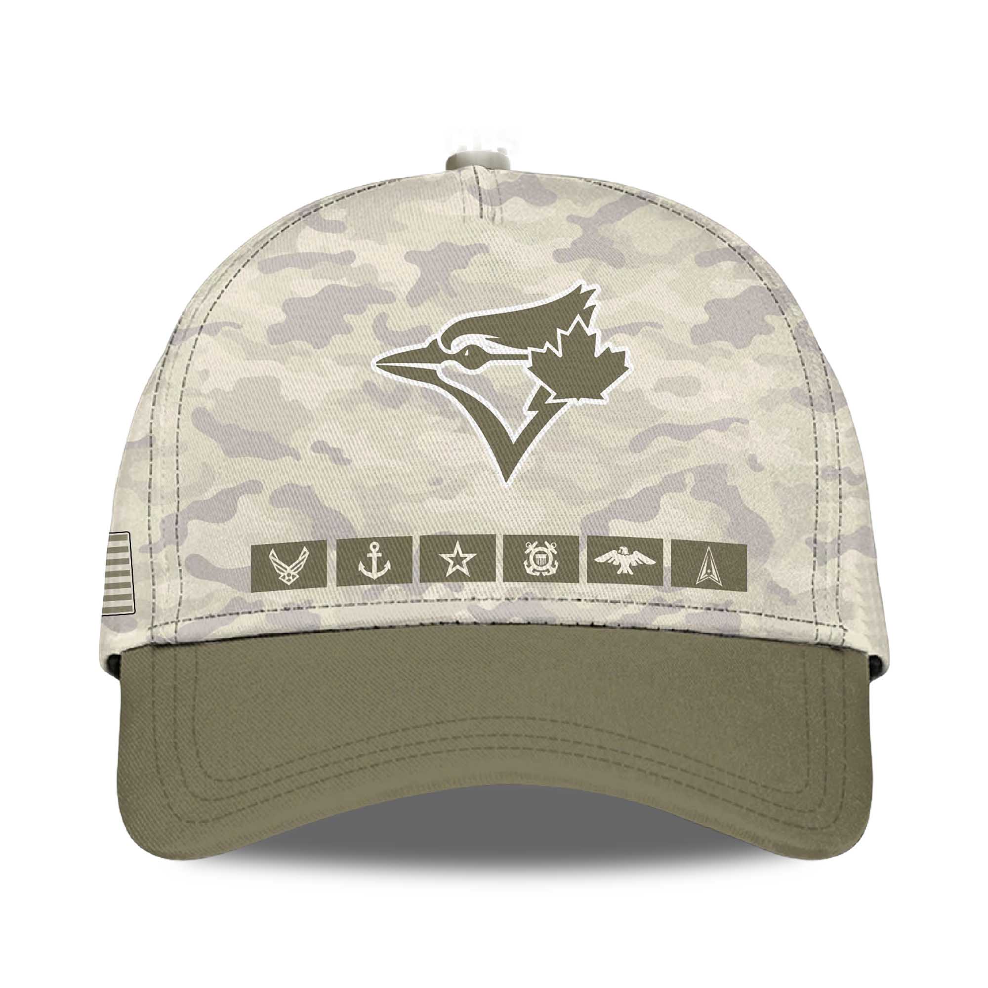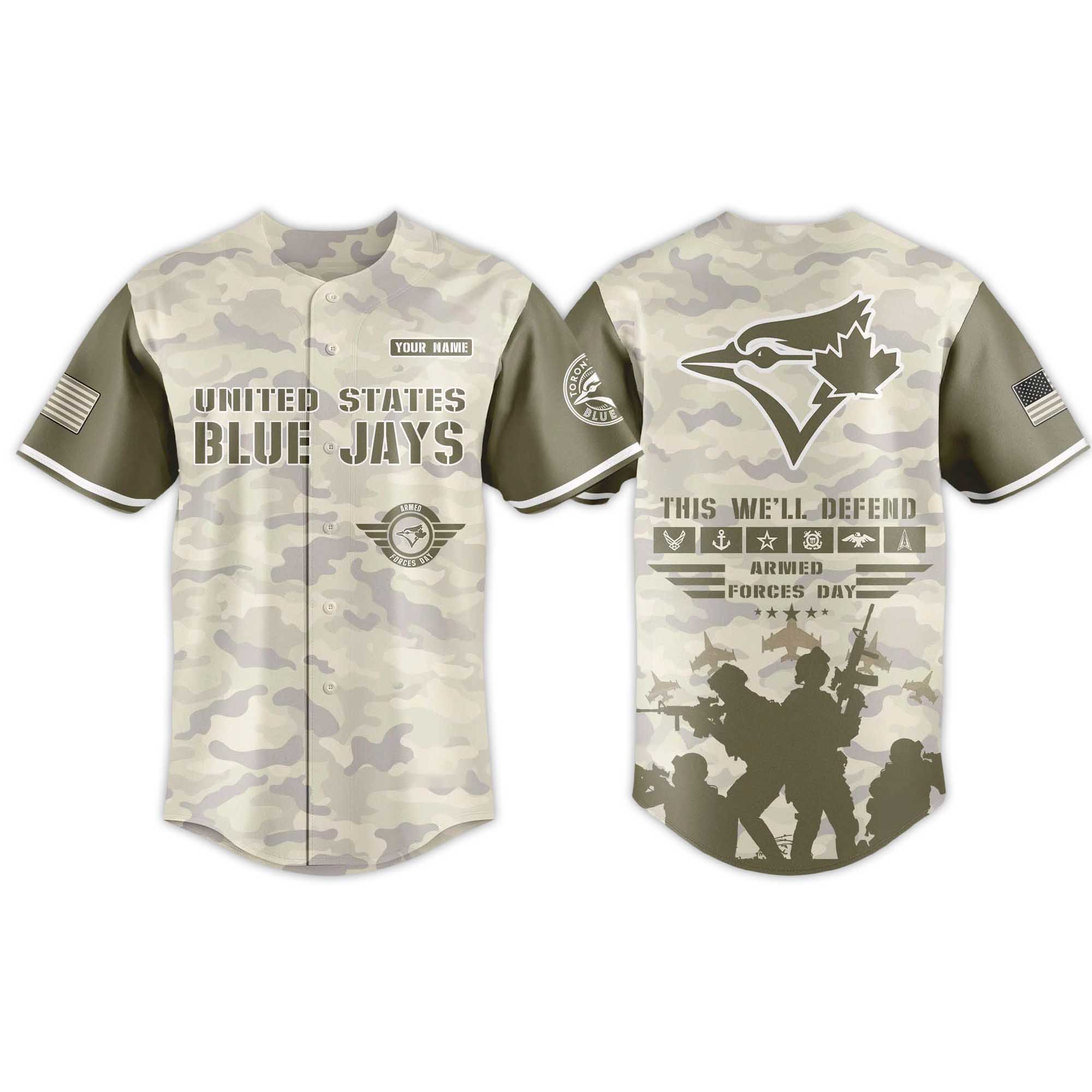 The shirt features a soft desert camouflage background combined with olive green sleeves for a striking military-inspired contrast. The United States Blue Jays lettering is bold on the chest for a powerful visual impact. Flag patches on the sleeves add a patriotic touch. The back features a large Blue Jays logo above the This We’ll Defend lettering, followed by silhouettes of military personnel. The design conveys a sense of strength, respect, and immediately captures the attention of fans who appreciate meaningful team attire.