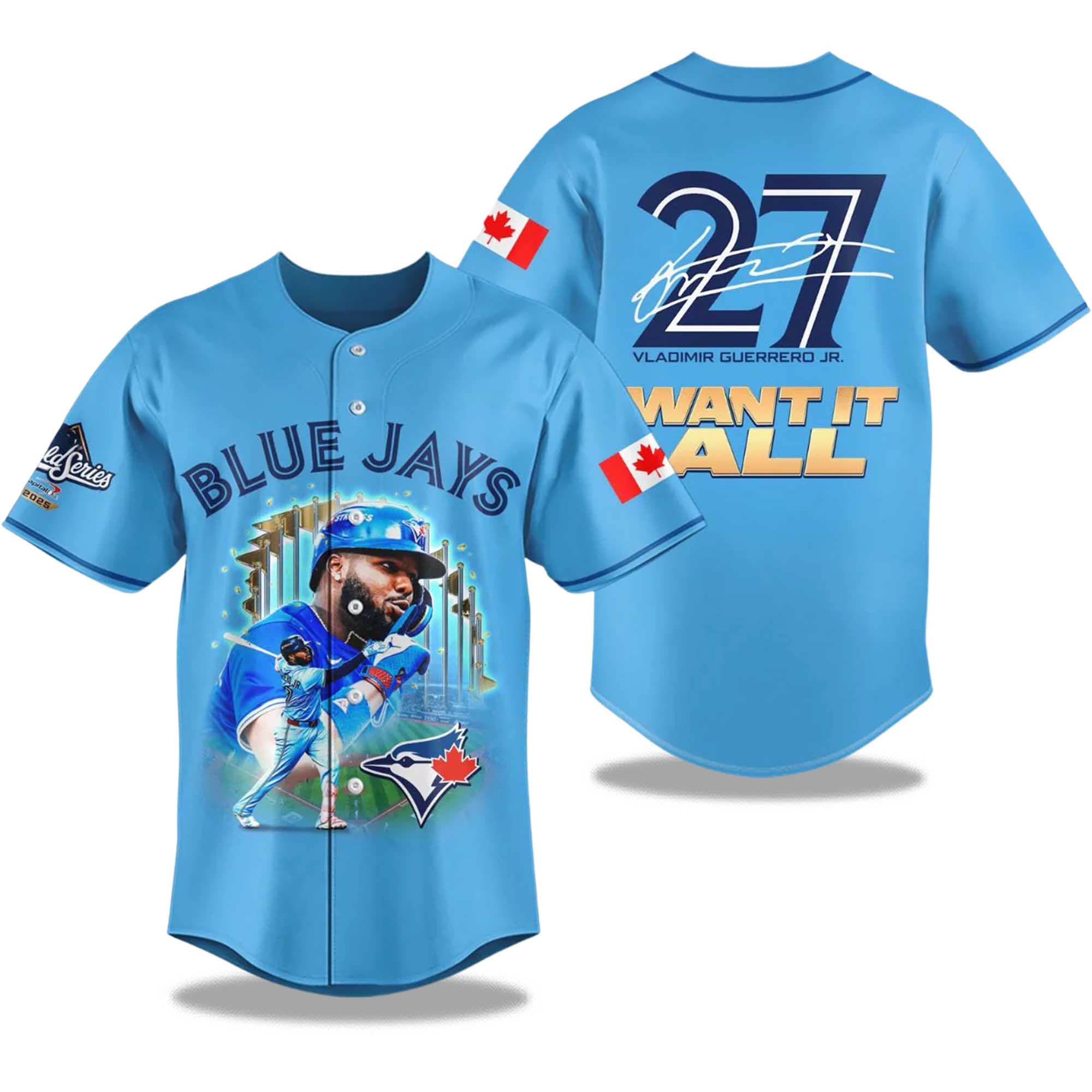 The Blue Jays Vladimir Guerrero Jr Want It All World Series 2025 Jersey embodies the unstoppable energy of Toronto’s multiple MVP and the team’s pursuit of baseball glory. This jersey celebrates Guerrero Jr’s relentless spirit “Want It All” reflecting the team’s desire to win the 2025 World Series. Every stitch exudes victory, passion, and fire, the qualities that define the true Blue Jays fandom. It’s more than just a jersey; it’s a piece of baseball history in motion.