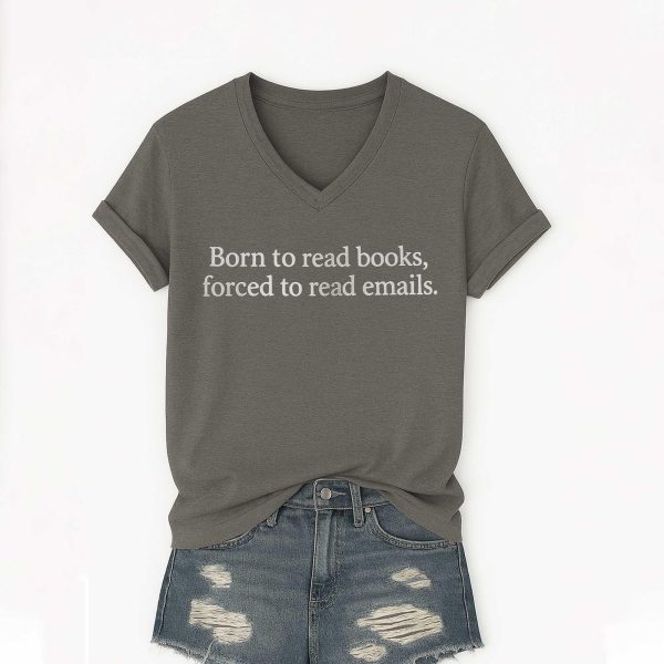 The Born To Read Books, Forced To Read Emails Shirt perfectly captures the endless struggle of book lovers navigating the modern workplace. This stylish black V-neck features a simple yet powerful message that resonates with book lovers everywhere who find themselves torn between their passion for literature and the inevitable realities of professional communication. Minimalist white text on black fabric creates a classic, versatile look that speaks volumes about the wearer’s priorities.