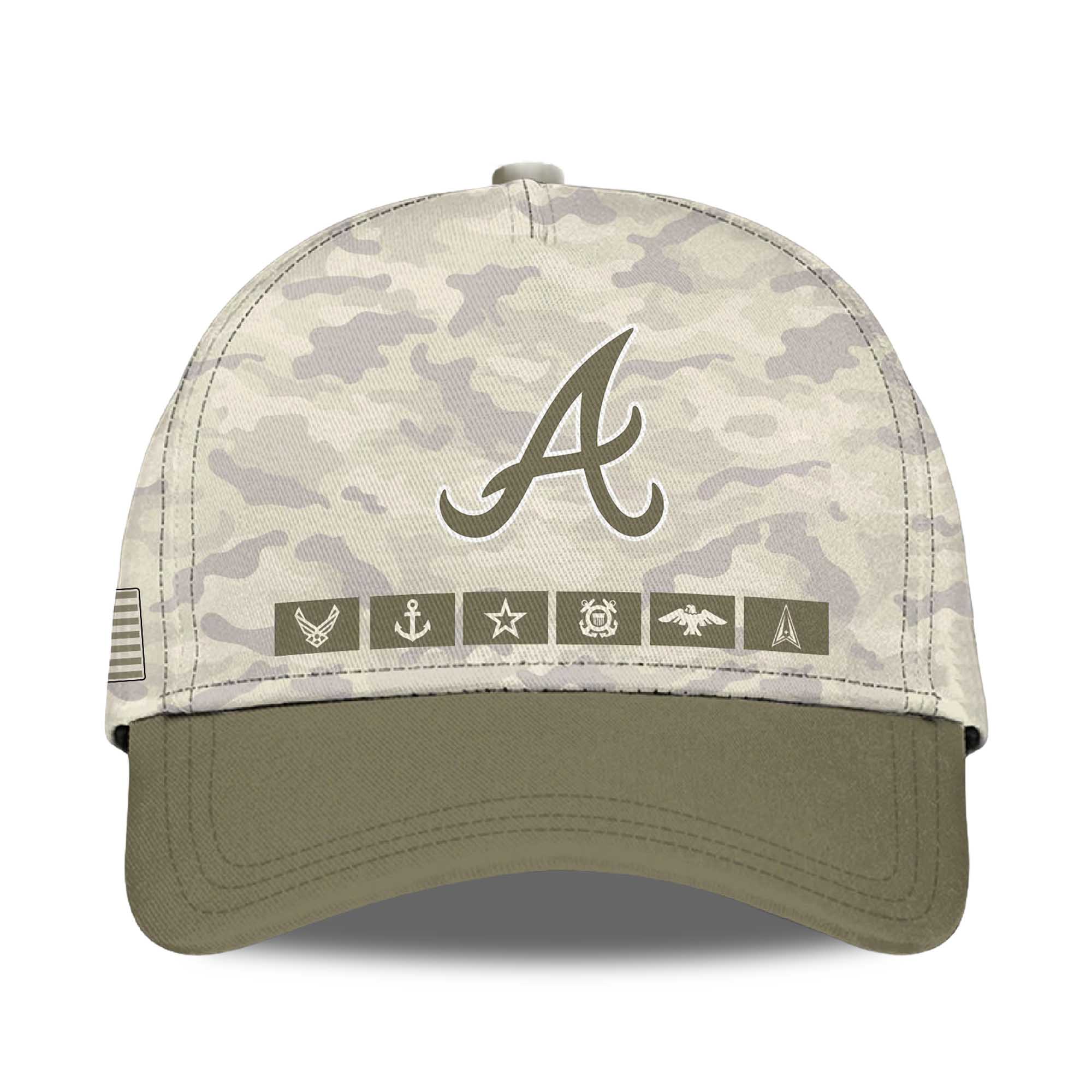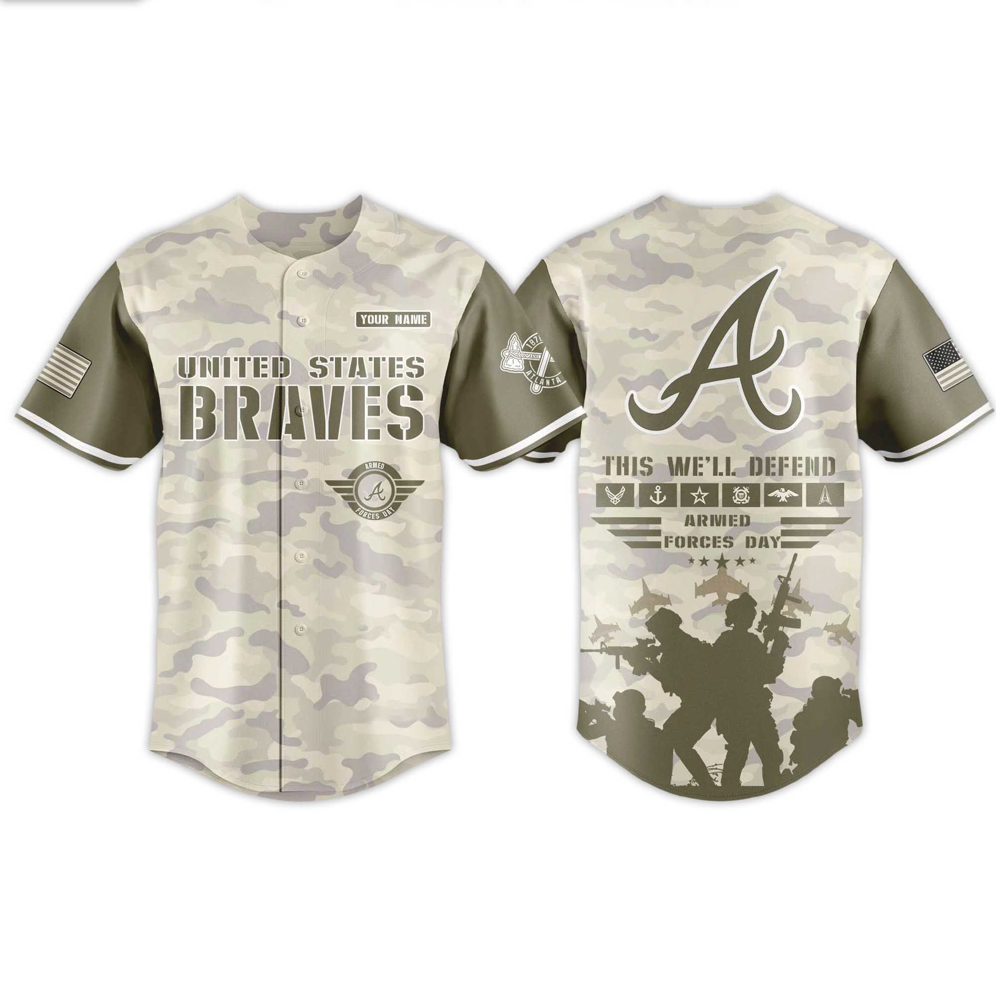 The jersey features a desert camouflage body paired with olive sleeves for a powerful, military-inspired look. On the front, the United States Braves lettering creates a strong statement of team pride. Flag patches on both sleeves add a patriotic touch. The back displays a large A logo above the This We’ll Defend lettering, followed by an impressive silhouette graphic of soldiers in action. Every detail comes together to create a jersey that shows respect, strength, and readiness for the season.