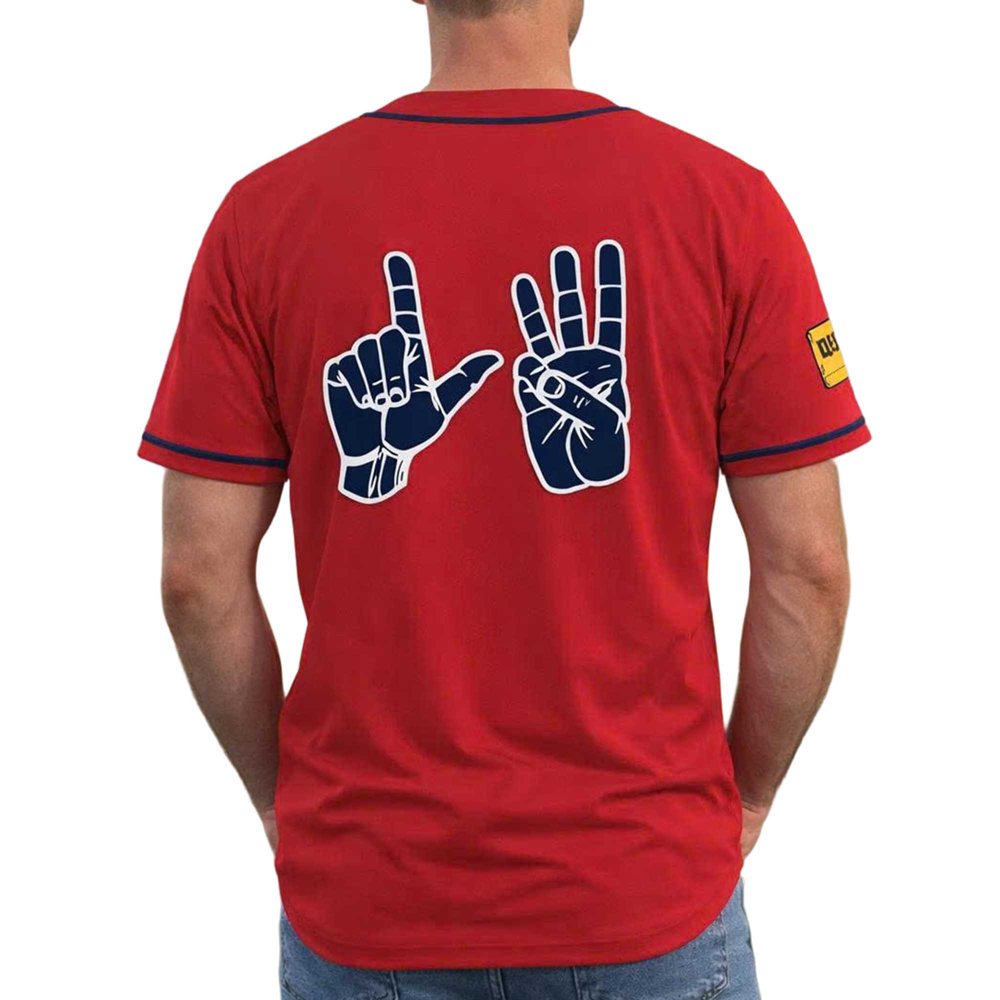 This jersey stands out thanks to its sophisticated combination of athletic imagery and sign language. The navy blue trim contrasts with the red fabric, while the detailed ASL hand gestures add texture and depth to the story. The front-button closure design creates a classic baseball look. Reinforced seams increase durability, and the relaxed fit allows for easy movement during everyday wear.